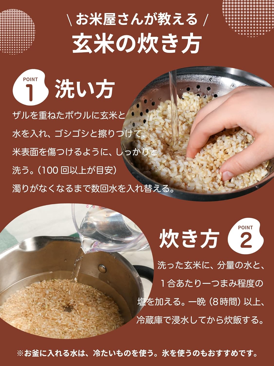 🌾玄米・精米に限らず、涼しいところで(夏場は特に冷蔵庫へ)保管してください。 お米の袋には破裂防止の通気孔がありますので、乾燥と虫の侵入を防ぐため、 密封容器(タッパーやペットボトルなど)に移し変えて保管がおすすめです。 少量の水滴などでもカビの原因となりますので、計量の際や保管時にお気を付けください。
