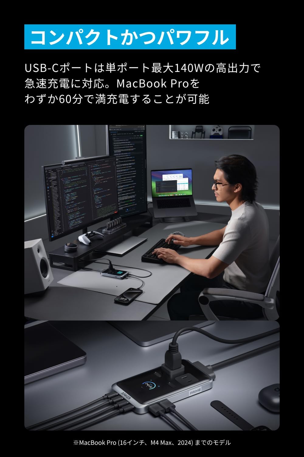 コンパクトかつパワフル:USB-Cポートは単ポート最大140Wの高出力で急速充電に対応。16インチのMacBook Proをわずか60分で満充電することが可能。