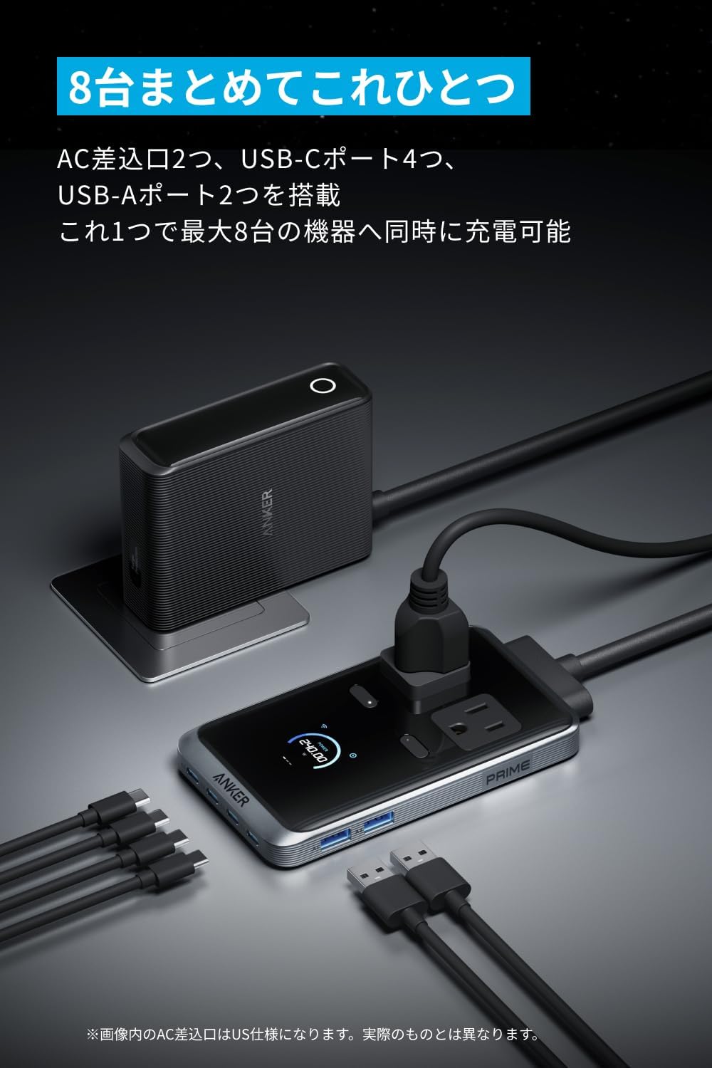 8台まとめてこれひとつ:AC差込口2つ、USB-Cポート4つ、USB-Aポート2つを搭載。これ1つで最大8台の機器へ同時に充電可能。