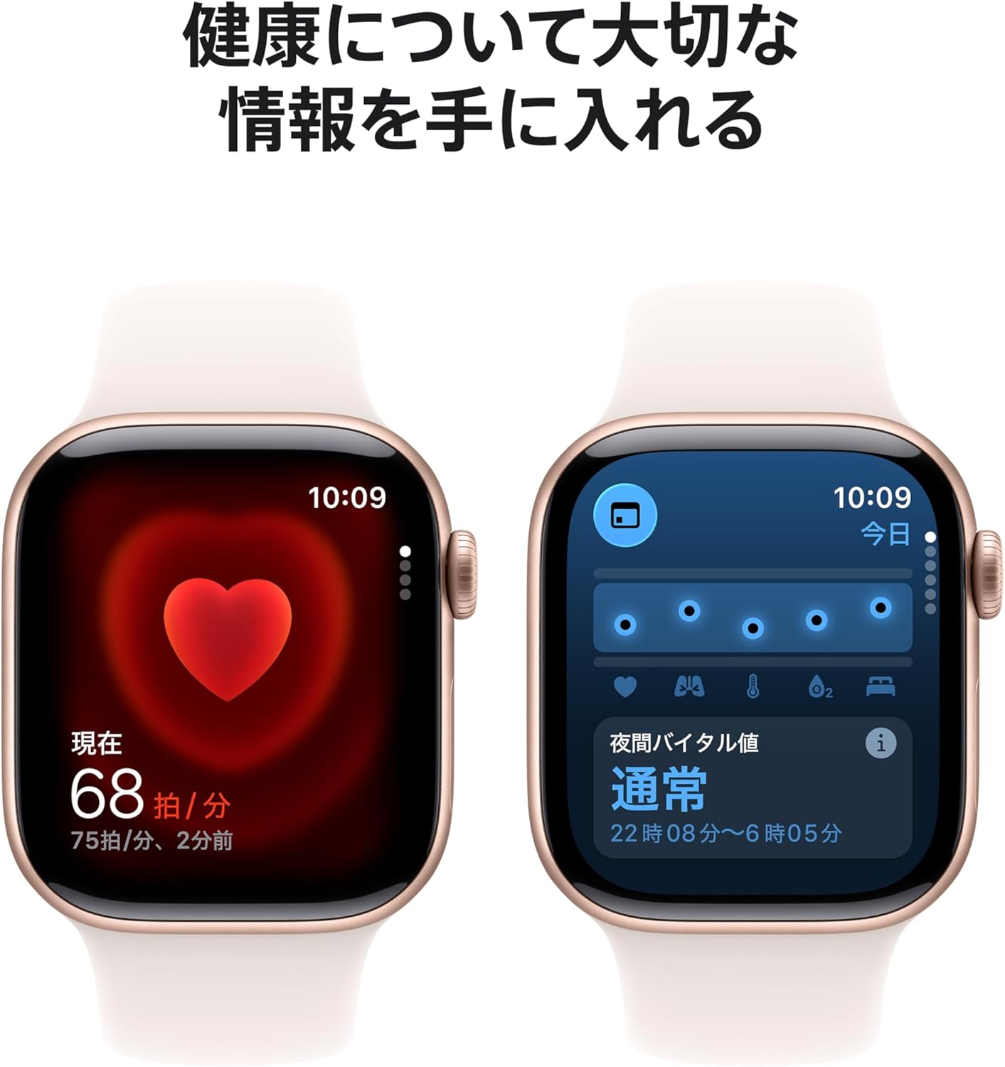 健康をより深く理解するための情報 — いつでも心電図を記録する。高心拍数と低心拍数、不規則な心拍リズム、睡眠時無呼吸の兆候が検出された場合に通知を受け取る。バイタルアプリで夜間の健康指標を確認する。あなたの体に取り込まれた酸素のレベルをチェックすることもできます。