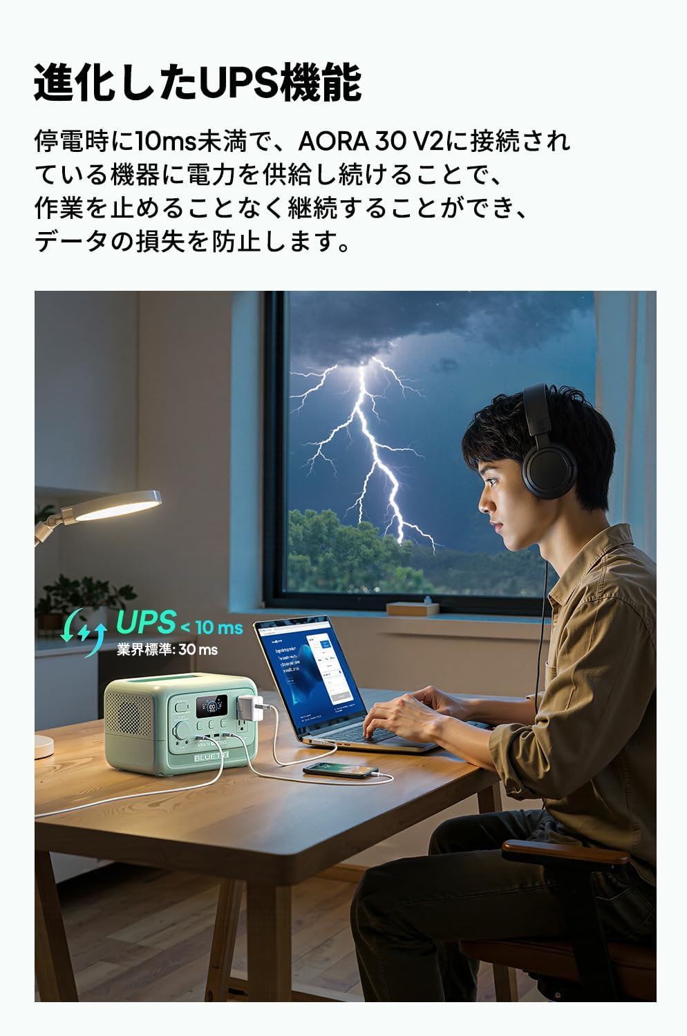 【日本専用設計|直感的操作と高安全性】BLUETTI AORA 30 V2 は日本市場専用に開発されたポータブル電源。画面表示・操作ボタン・取扱説明書の日本語対応で、誰でも簡単操作。防災グッズとして屋内保管する場合も、アウトドアでの使用時も、機能美と実用性を兼ね備えています。筐体はUL94V-0認証の難燃材を使用し、過充電・過熱をリアルタイム監視するBLUETOPUS BMS(バッテリー管理システム)で、家族の安全を守ります。