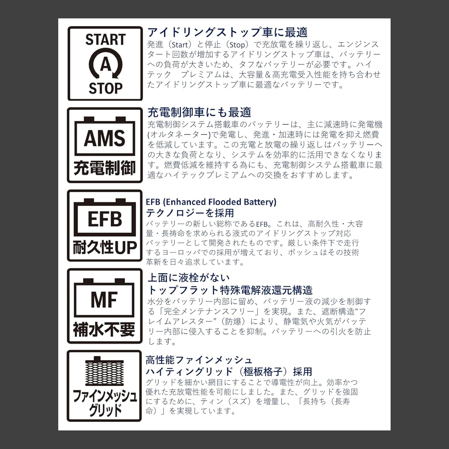●EFB (Enhanced Flooded Battery) テクノロジーを採用。