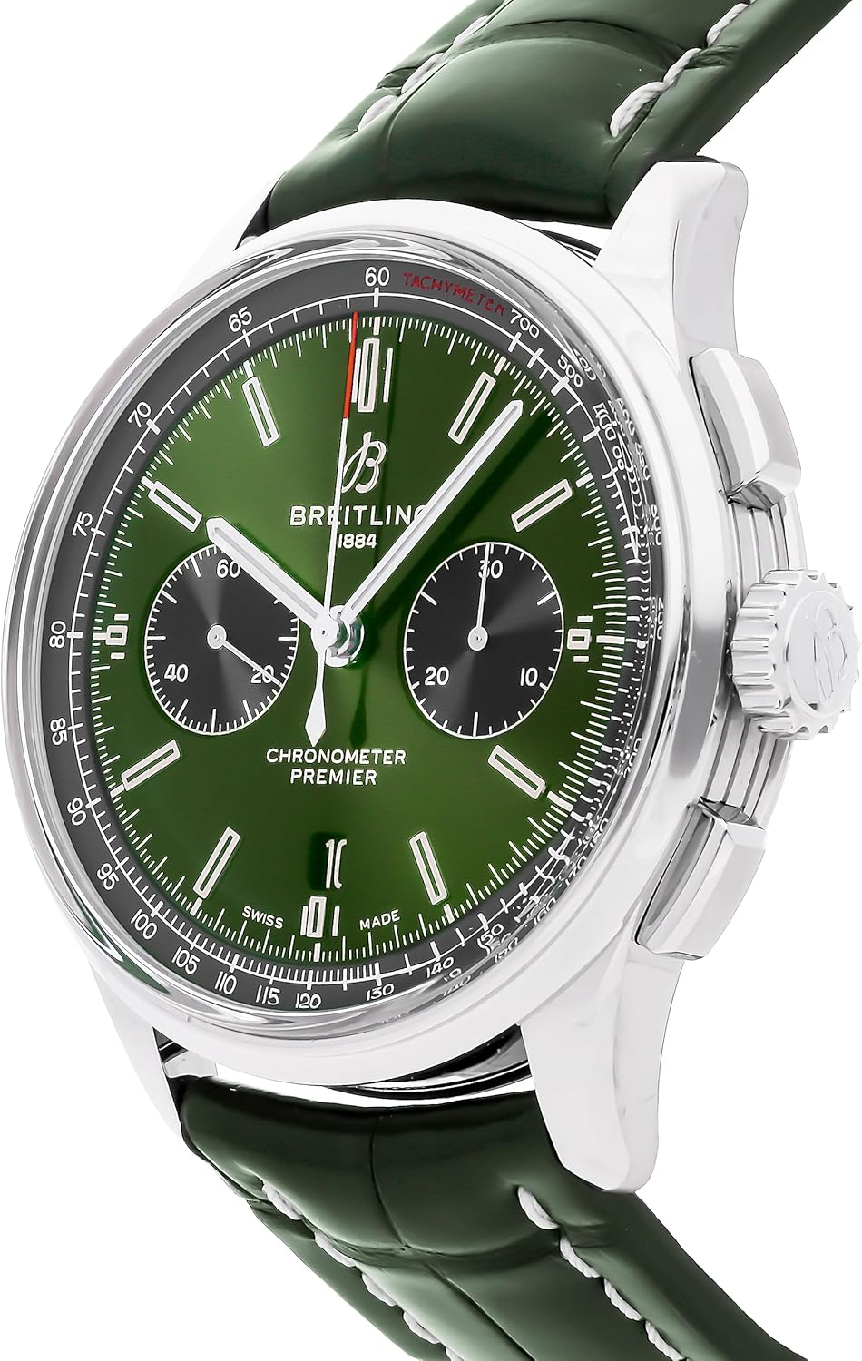 中古ブライトリング プレミア B01 クロノグラフ (AB0118221L1P2) 自動巻き腕時計。42mmのステンレススチールケースが、グリーンのワニ口ストラップにグリーンの文字盤とステンレススチールのタングバックルが付いています。 機能には、時間、分、スモールセコンド、日付、クロノグラフが含まれます。 この時計には、オリジナルのボックスと紙が付属しています。 ほとんどの時間は工場保証に残っています!