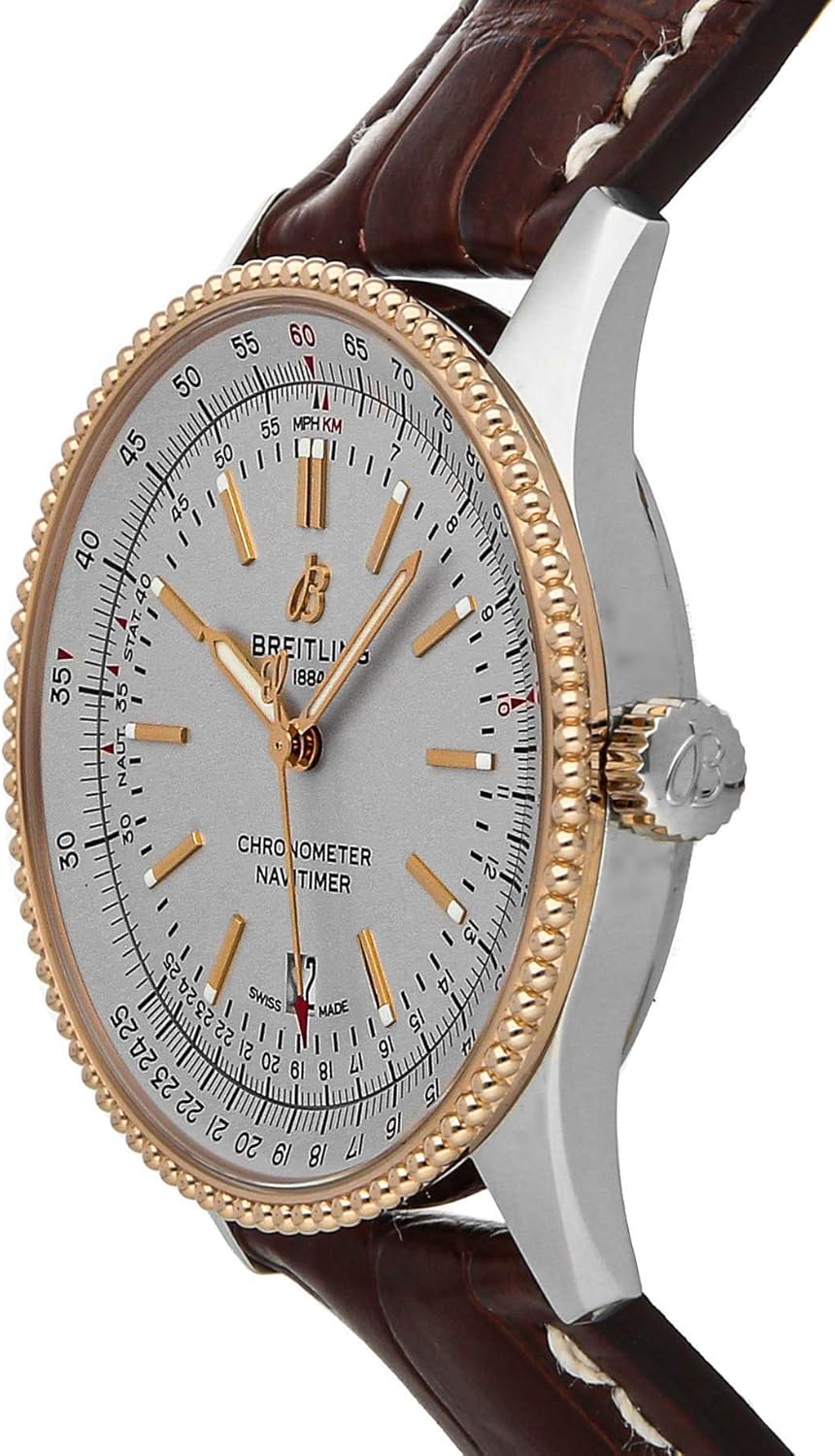Breitling Navitimer Automatic(U17326211G1P1)自動巻き腕時計は、41mmのステンレススチールケースと18Kローズゴールドベゼルがシルバーの文字盤を囲み、ブラウンのワニ口ストラップにステンレススチールのタングバックルが付いています。 機能には、時間、分、秒、日付、計算尺が含まれます。 この時計は箱と紙が付属しています。 ほとんどの時間は工場保証に残っています! 1884年にLeon Breitlingによって設立された同社は、産業および科学目的のカウンターとクロノグラフのメーカーとして概念化されました。 10年も経たないうちに、Breitlingがその革新的デザインと機能性によって「ヒット」になったことが明らかになりました。 同社の最も注目すべきクライアントには、アメリカ軍や主要な国際航空会社が含まれます。