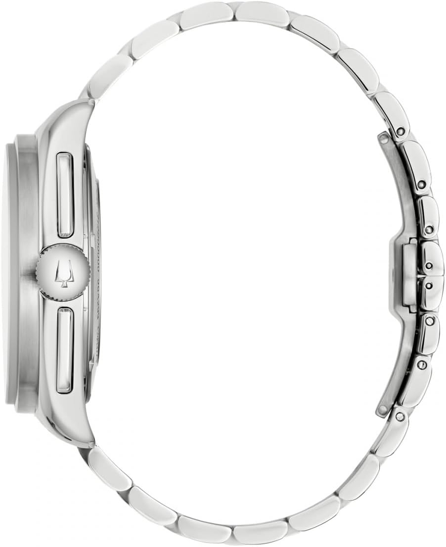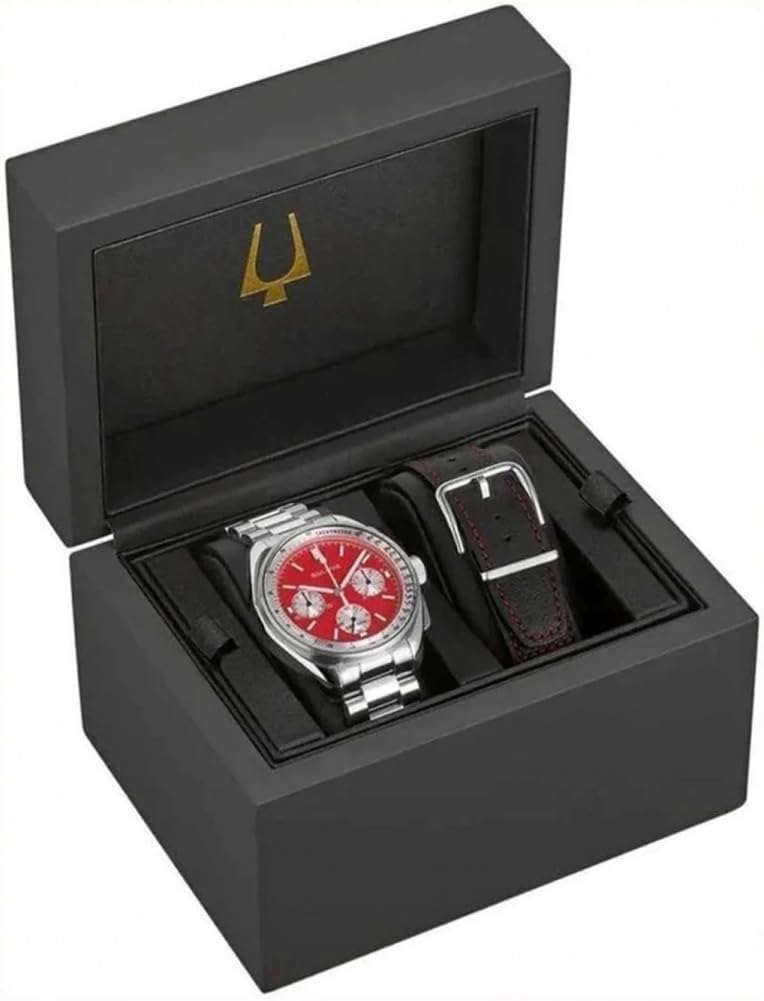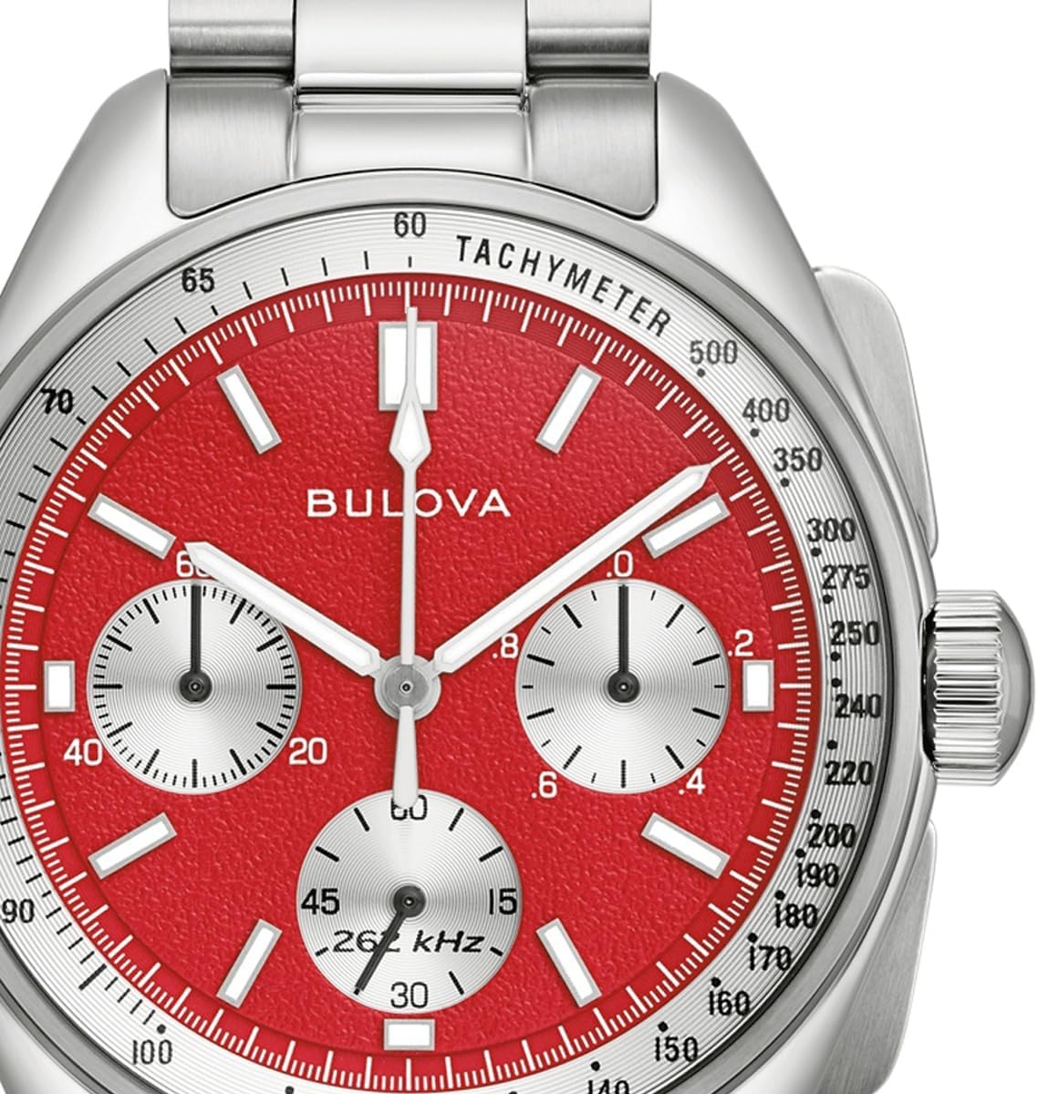 Bulova Lunar Pilot 43.5mmクロノグラフウォッチの優雅さと精度をお楽しみください。 高精度のNP20-Y0Zクォーツムーブメントは、振動周波数262kHzで、標準的なムーブメントの8倍の精度で、月に最大5秒の精度を発揮します。 鮮やかな赤い文字盤にホワイトのアクセントとタキメーターベゼルが魅力的な一品です。 1/20秒の精度とカレンダーを備えた60分クロノグラフが特徴です。 ステンレススチール製のケースとブレスレットにはダブル安全クラスプが付いており、耐久性があります。 さらに、汎用性を高めるために赤いステッチが施された交換可能なブラックレザーストラップが付いています。 スポーティーでエレガントな腕時計。あらゆる機会に。