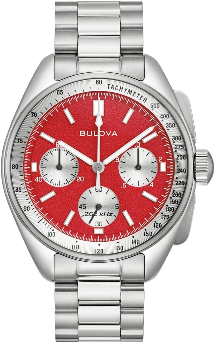 Bulova Lunar Pilot 43.5mmクロノグラフウォッチの優雅さと精度をお楽しみください。 高精度のNP20-Y0Zクォーツムーブメントは、振動周波数262kHzで、標準的なムーブメントの8倍の精度で、月に最大5秒の精度を発揮します。 鮮やかな赤い文字盤にホワイトのアクセントとタキメーターベゼルが魅力的な一品です。 1/20秒の精度とカレンダーを備えた60分クロノグラフが特徴です。 ステンレススチール製のケースとブレスレットにはダブル安全クラスプが付いており、耐久性があります。 さらに、汎用性を高めるために赤いステッチが施された交換可能なブラックレザーストラップが付いています。 スポーティーでエレガントな腕時計。あらゆる機会に。