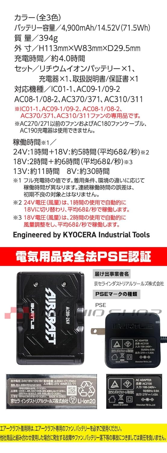 セット:リチウムイオンバッテリー×1 充電器×1 ファン×2 ファンケーブル×1 ファンフィルター×2 取扱説明書/保証書×1 ・AC09 リチウムイオンバッテリー