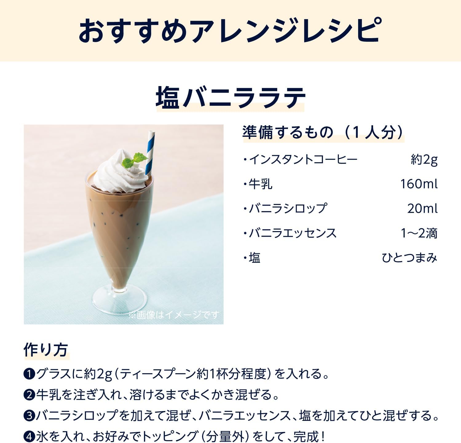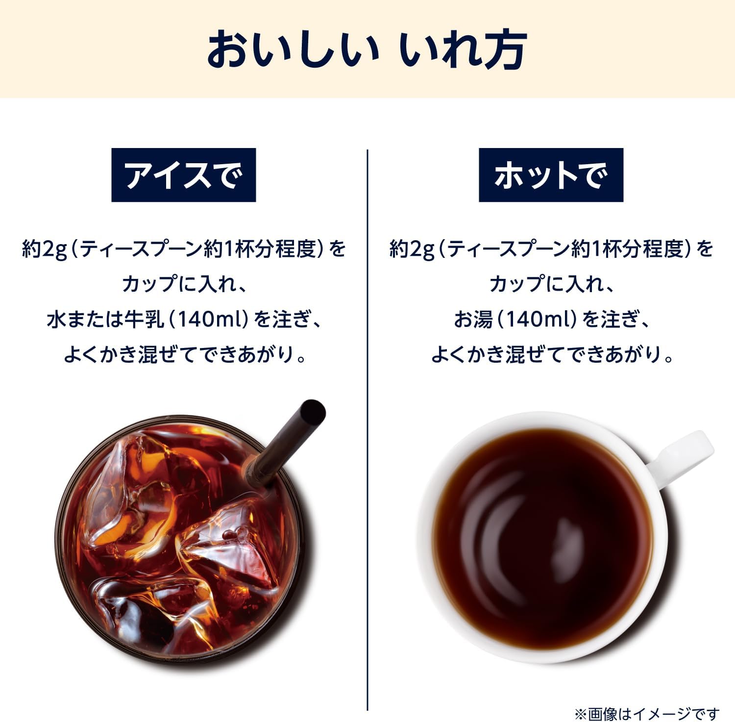 アイス:ティースプーン1杯(約2g)をグラスに入れ、水または牛乳(140ml)を注ぎ、よくかき混ぜてできあがり。