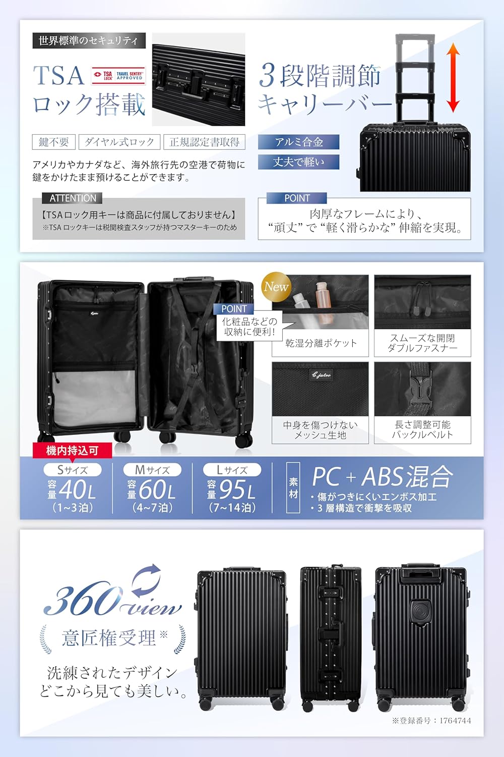 ✅【サイズ&カラー】スーツケースは4サイズ、2色展開<サイズ>総外寸:高さ×横幅×奥行(cm)、容量(L)、重量(kg) Miniサイズ : 41.7 × 42 × 24 、29L 、 2.8kg、Sサイズ : 55.5× 35.5 × 24 、3辺合計115cm(機内持込可)、 45L 、 3.4kg、Mサイズ : 66.5 × 43 × 27.5 、3辺合計137cm、 60L 、 4.2kg、Lサイズ : 76 × 49.5 × 31.5 、3辺合計157cm 、 95L 、 5.4kg<カラー>ブラック(Black)、シルバー(Silver)