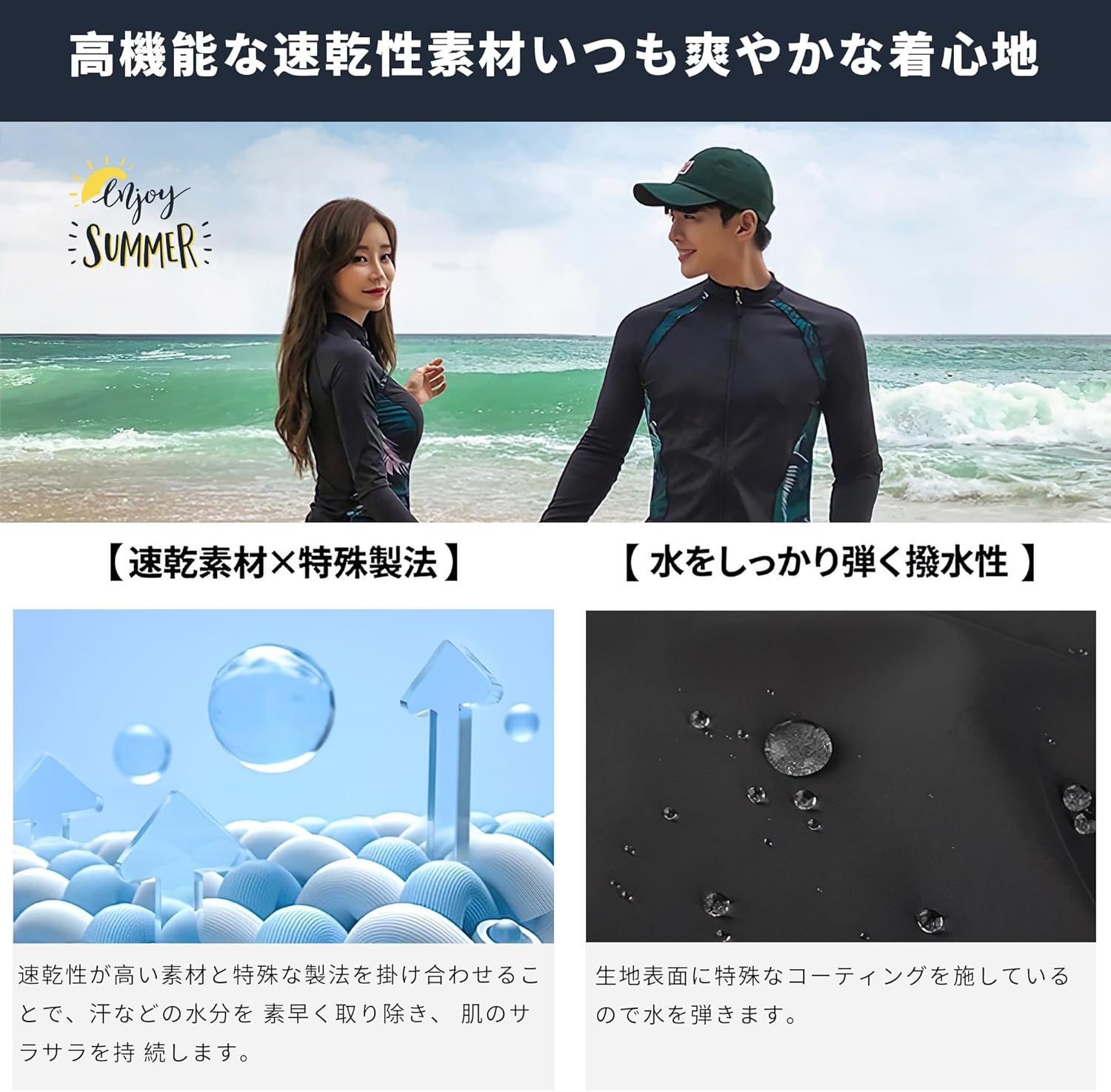 滑らかな肌触りでありながら、 UVカッ トだけでなく通気性・吸水性・速乾性 にも優れた素材です。今季トレンドのスポーティーなデザインで、スイムウェアとしてだけでなく、ランニングやジムなどスポーツウェアとしても使えます。