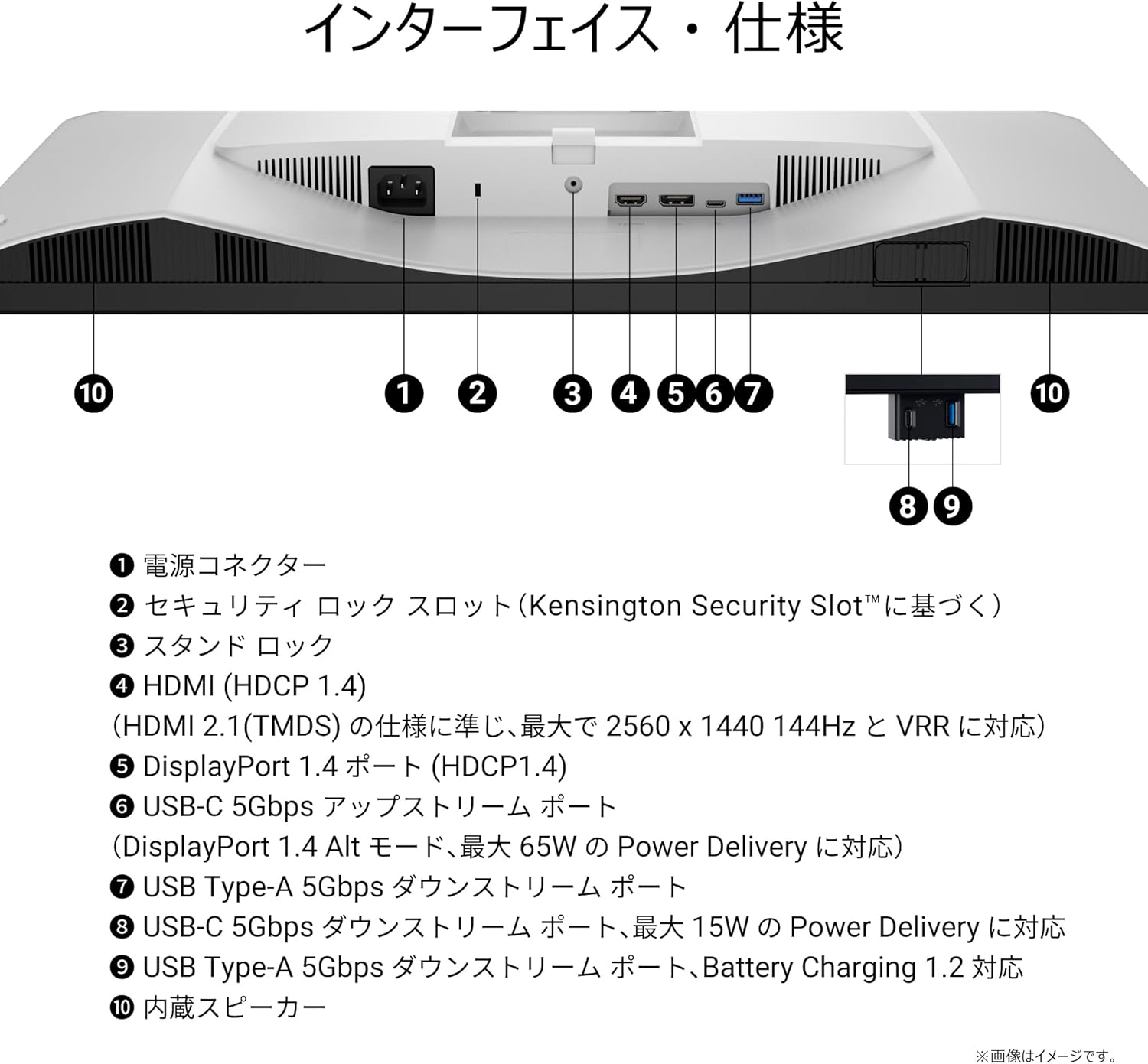 [接続端子]USB-C(UP)(Power Delivery up to 65 W)x1,HDMI(HDCP1.4)(HDMI 2.1で規定されているとおり、最大でQHD 2560 x 1440, 144 Hz, TMDS, VRRをサポート)x1,DP1.4 x1,USB-C(down)x1,USB-A(down)(BC1.2)x1,USB-A(down) x1