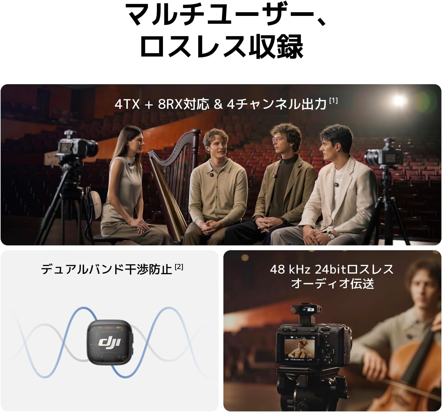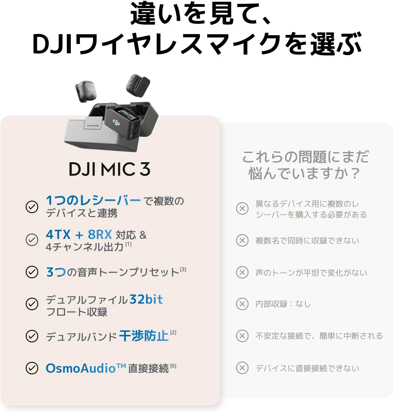 – DJI Mic 3(1 TX + 1 RX) には、TX 1台、RX 1台などが付属しています。各種コンテンツ制作での収録に柔軟性を求めるクリエイターに最適です。