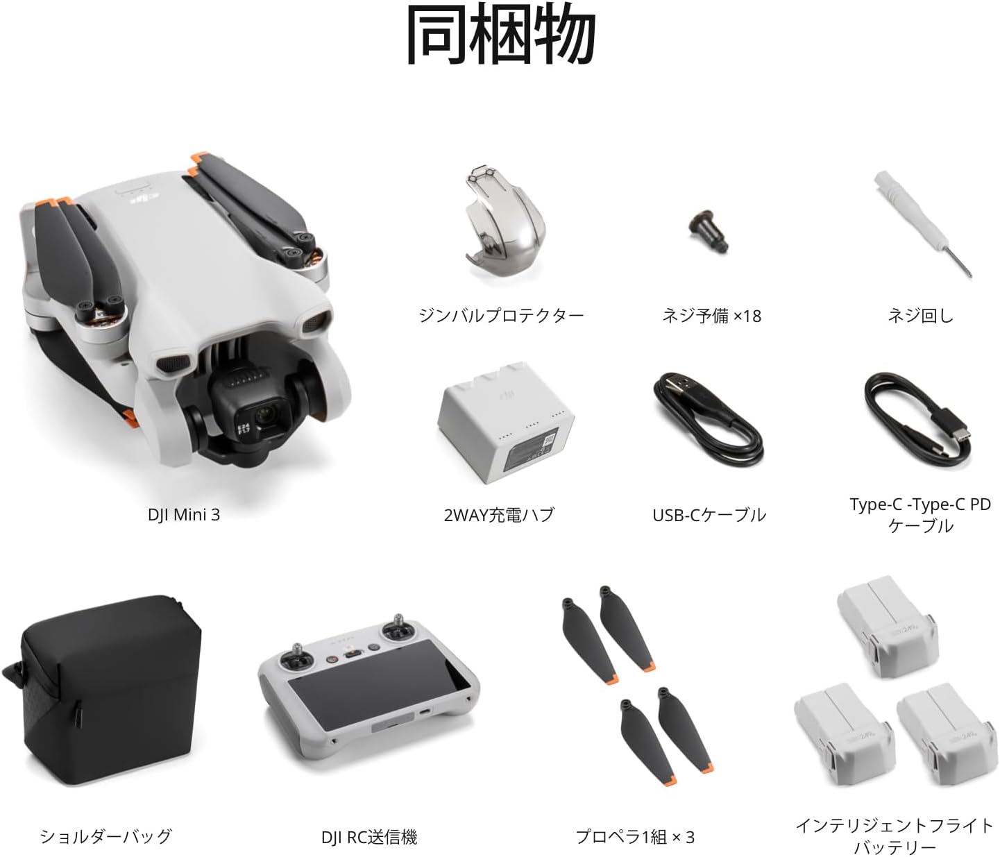 インテリジェントフライトパッテリー(38分)×3、2WAY充電ハブ、ショルダーバッグ、予備プロペラ、その他アクセサリーが追加で同梱されます。