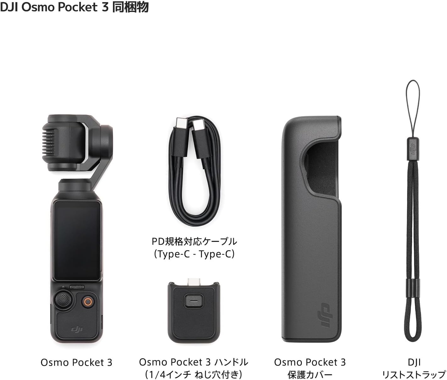 – Osmo Pocket 3 標準版は、標準的なオプションとなり、ポケットジンバルカメラ、保護カバー、 リストストラップ、ハンドル(1/4インチ ねじ穴付き)などを同梱し、すぐに撮影を開始できます。