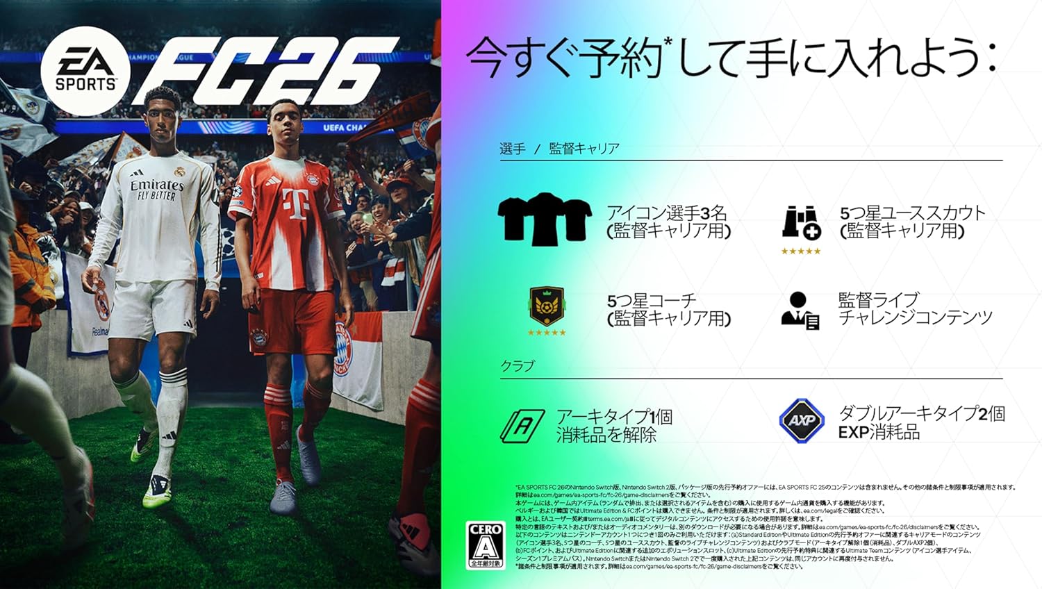 予約特典DLC内容:クラブ報酬〈アーキタイプ解除1個(消耗品) & ダブルAXP 10試合分x2個(消耗品)〉・キャリア報酬〈アイコンキャリア選手3名 & 監督キャリアで5つ星コーチを雇用可能 & 5つ星のユーススカウトが監督キャリアで使用可能 & 監督ライブチャレンジコンテンツ〉