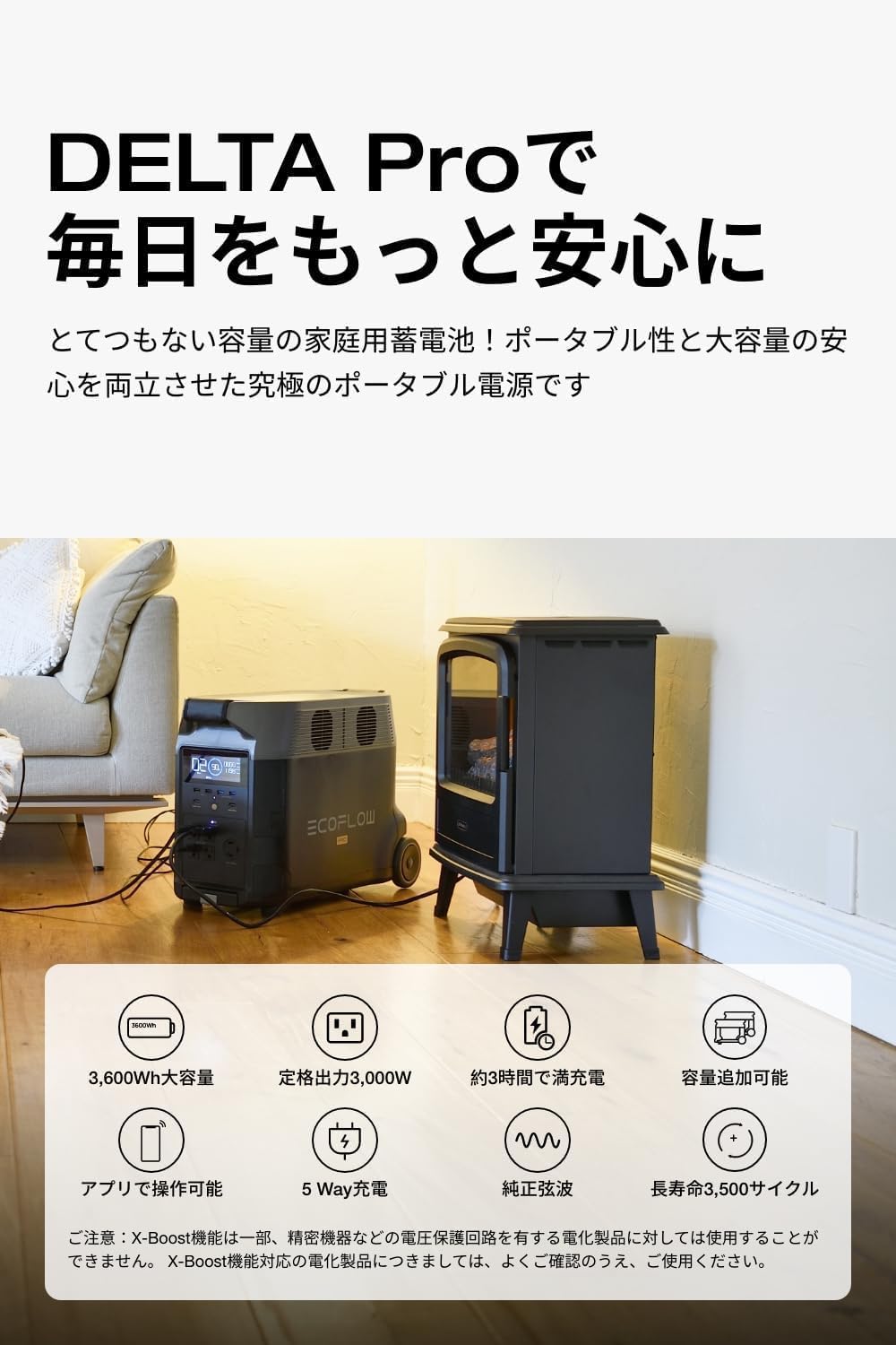 【電気製品99.9%に対応可能な、圧巻の高出力】EcoFlow DELTA Proは「定格出力3,000W/瞬間出力6,000W」を誇り、ドライヤーと電子レンジを同時に使用しても有り余るほど。また、最大15デバイスを同時給電できるので、キャンプなどのアウトドアだけでなく、災害時にスマホの複数台充電や電気毛布、ファンなどへの給電にも活躍します。DELTA Pro2台をダブルボルテージハブ(*3)でつなげると定格出力6000Wにもなり、起動時に出力3,000Wを超える200V家庭用エアコンも軽々と起動できます。