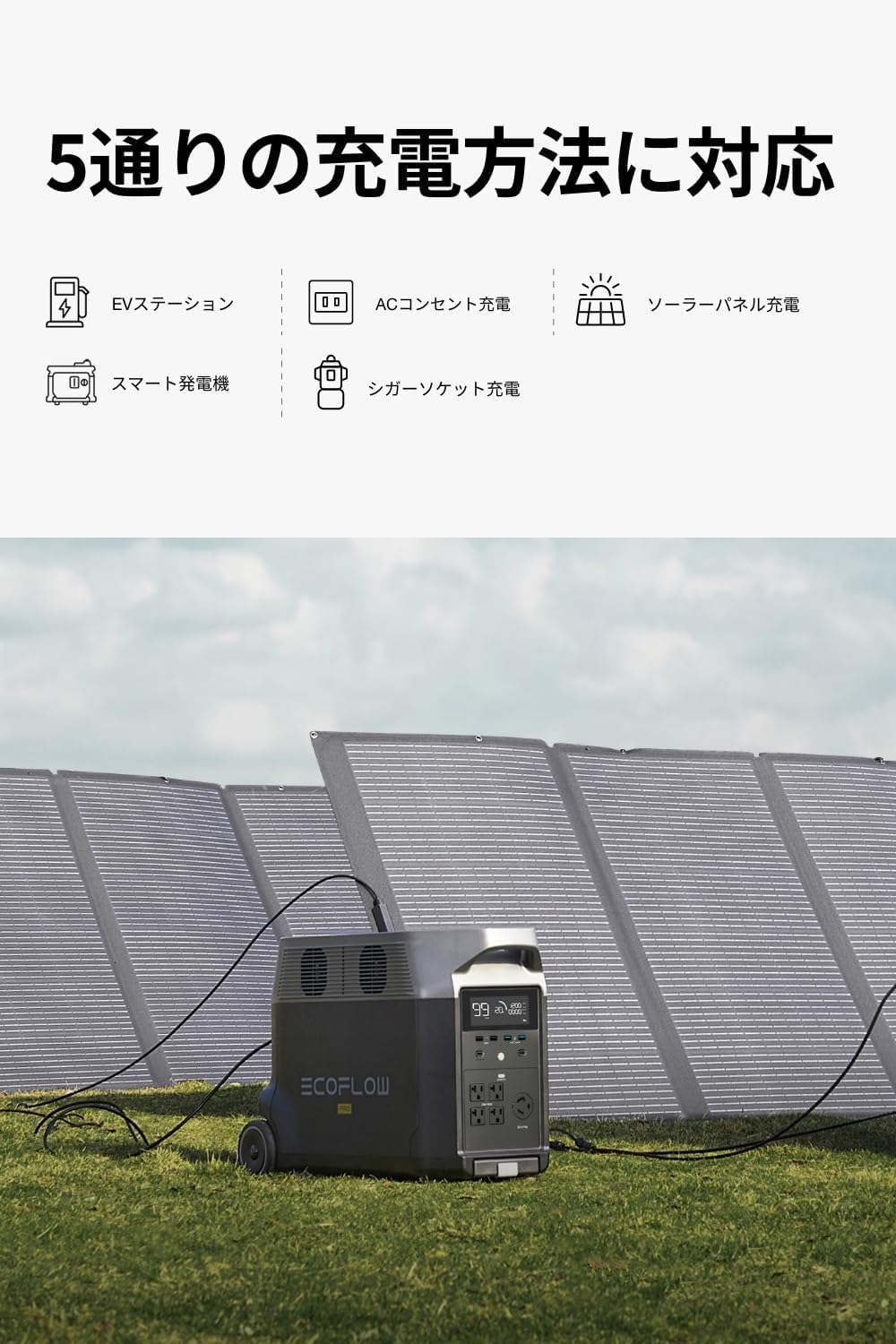 【さらに容量拡張可能】EcoFlow DELTA Proは、ポータブル電源では想像できないほどの容量3,600Whを誇ります。これに、専用のエクストラバッテリーを最大2台接続することで、容量を10,800Whへと増やすことが可能です。これは停電時に必要な家庭の電力の約6日間の容量に相当し、あなたとあなたのご家族の命を守ることができます。更に、DELTA Proには最大2台のエクストラバッテリーを接続可能なので、それをもう1セット用意すれば、最大容量は21,600Whにもなり、脅威の汎用性を誇る超大容量の家庭用蓄電池へと様変わりします。
