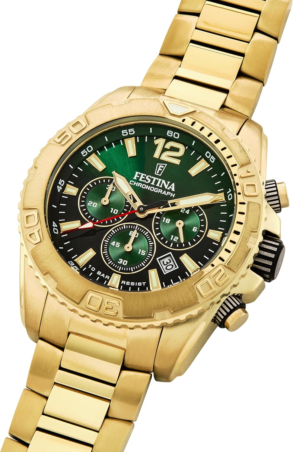 このメンズ向けFestina TimelessクロノグラフF20684/3腕時計は、円形の金メッキステンレススチールケースを備えています。 チェーンは金メッキスチールとゴールドベゼルに番号が付いています。 グリーンの文字盤カラー、金メッキの針とインデックス。 ミネラルクリスタル、クォーツムーブメント、アナログ表示。 防水:10気圧 直径:45mm。 機能:クロノメーター、3針、カレンダー。 3年間の保証。 Festinaウォッチをお楽しみください。