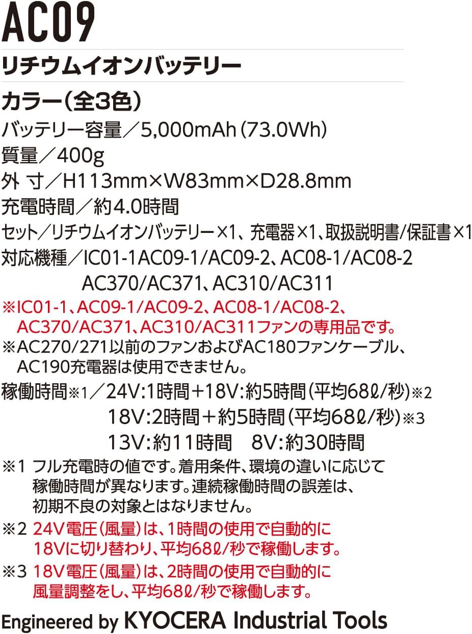 [ AC09 ] リチウムイオンバッテリー バッテリー容量:5,000mAh / 14.6V(73.0Wh)・重量:400g・外形寸法:H113mm × W84.5mm × D29.5mm・充電時間:約4時間・対応する機種:AC09-1 / 09-2、AC08-1 / 08-2、AC310 / 311 ※AC09-1 / 09-2、AC08-1 / AC08-2、AC370 / 371、AC310 / 311専用 ※AC270 / 271以前のモデルやAC180ファンケーブル、AC190充電器との互換性はありません。 稼働時間※1 24V:1時間+18V:約5時間(風量平均68リットル/秒)※2・18V:3時間+約4.5時間(風量平均68リットル/秒)※3・13V:約11時間・8V:約30時間 ※1フル充電した際の目安です。使用条件や環境により、稼働時間が異なることがあります。連続使用の時間差については初期不良として認められません。※2 24V(風量)は1時間使用後、18Vに自動的に切り替わり、平均68リットル/秒の風量で動作します。 ※3 18V(風量)は2時間使用後、風量が自動調整され、平均68リットル/秒で動作。