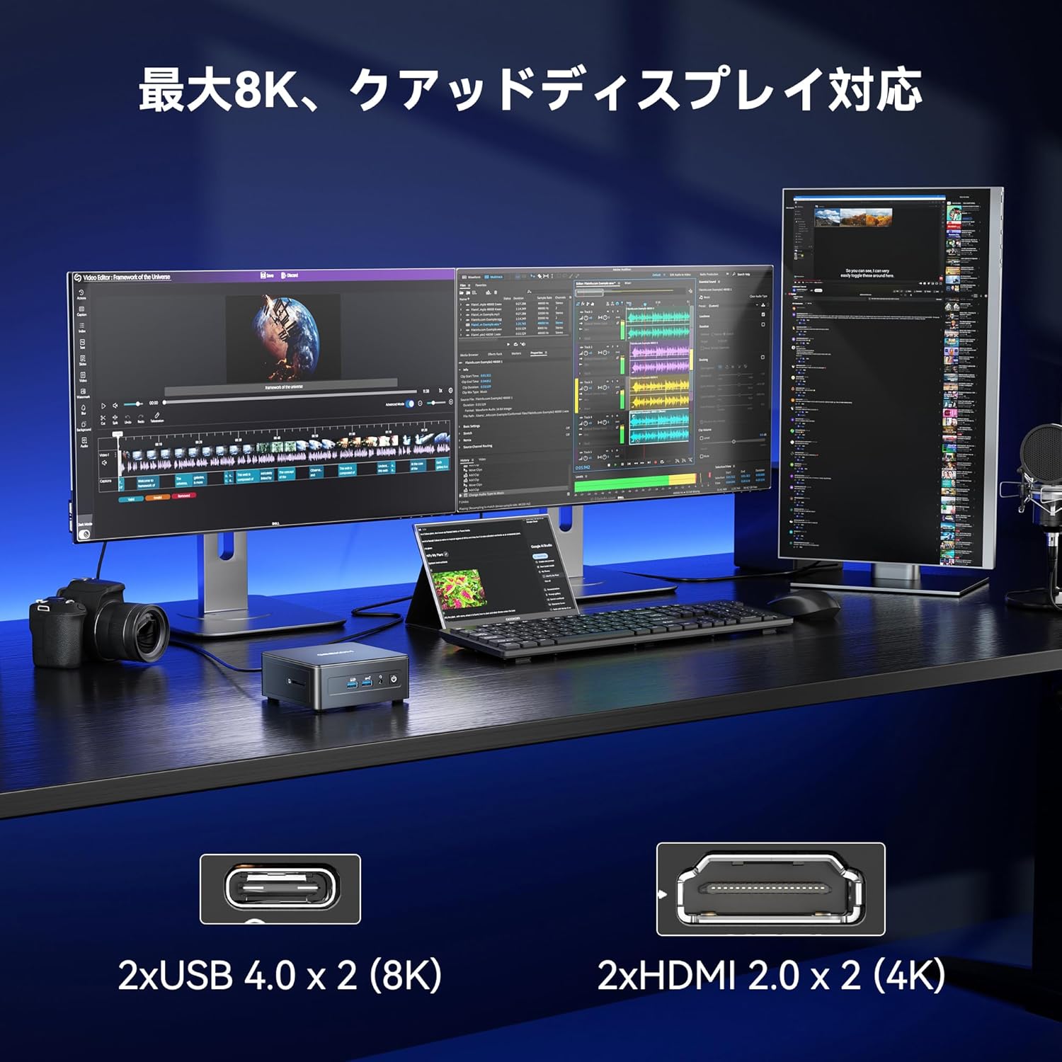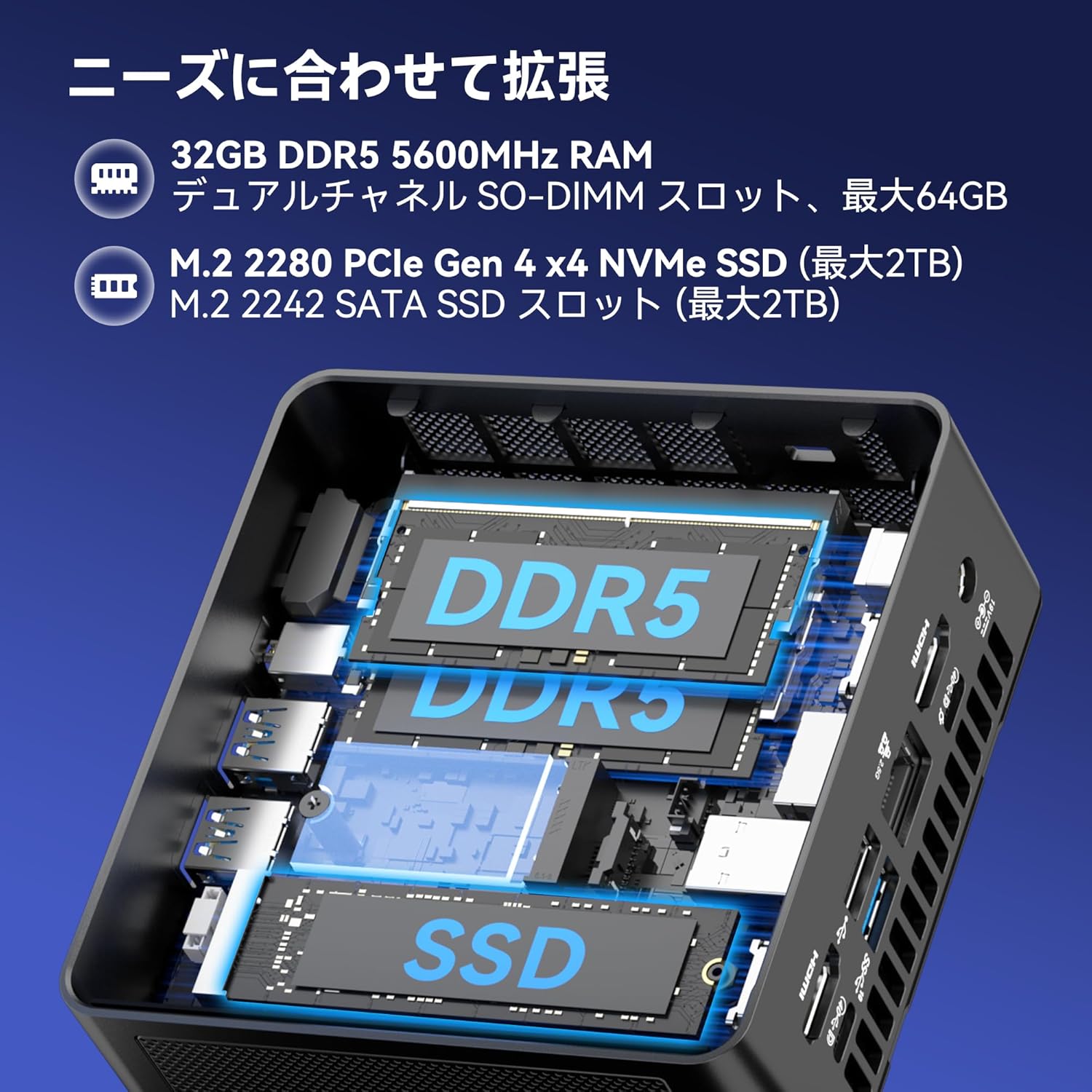 💾✨【大容量・高性能の新基準:32GB+2TBストレージ】32GBのDDR5メモリ(最大7467MHz)と2TBのPCIe 4.0 NVMe SSDを軽量ボディに凝縮した次世代ミニpcが登場しました。DDR5 262PIN 5600MHz SODIMMを採用し最大64GBまで拡張可能なメモリ構成と、NVMe x4 Gen4規格の大容量SSDにより、Photoshopでの大規模画像処理やブラウザのタブ大量起動時でもメモリ使用率70%未満を維持。ビジネスシーンでのストレスを徹底排除するとともに、ゲームタイトルや4K動画素材といった大容量ファイルもローカルで即時アクセス可能な性能を実現しています。