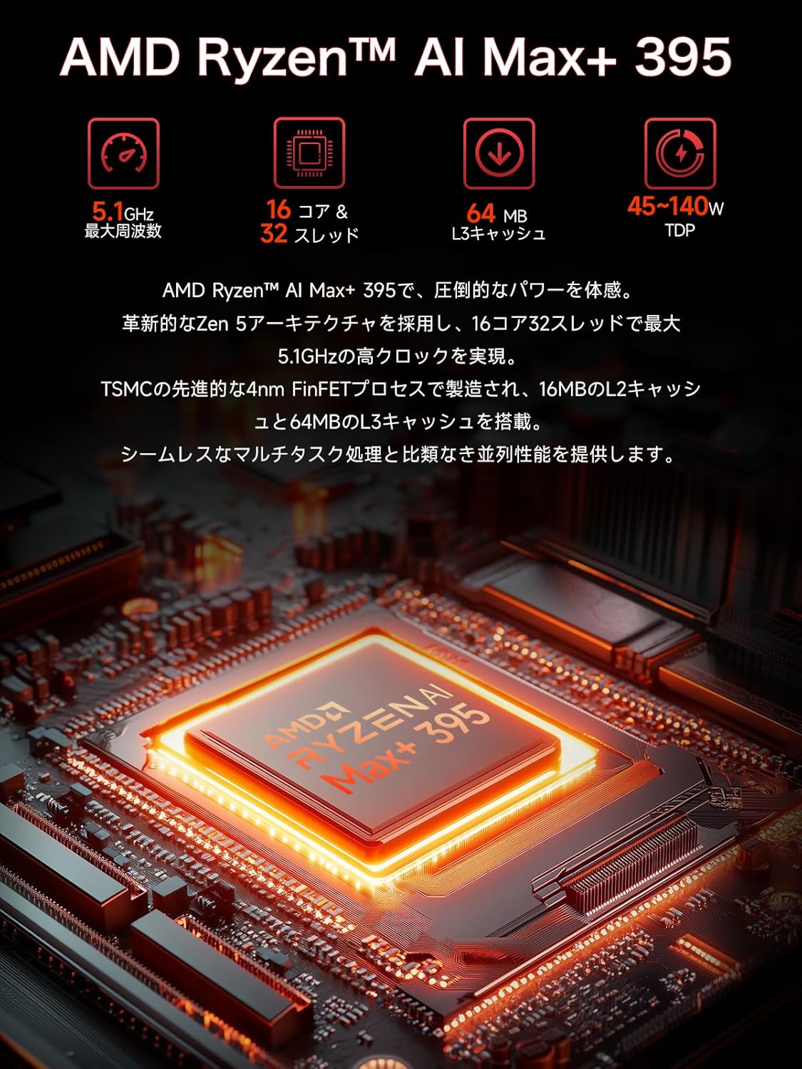 【世界初、最大126TOPSのAI超演算性能 – Ryzen AI Max+ 395 搭載】 TSMC 4nmプロセスによる16コア32スレッドCPUと新世代XDNA 2 NPUを統合したRyzen AI Max+ 395は、最大126TOPSのAIパフォーマンスを発揮。生成AI・ローカルLLM処理・画像認識など、プロフェッショナル用途にも十分な演算性能を提供します。
