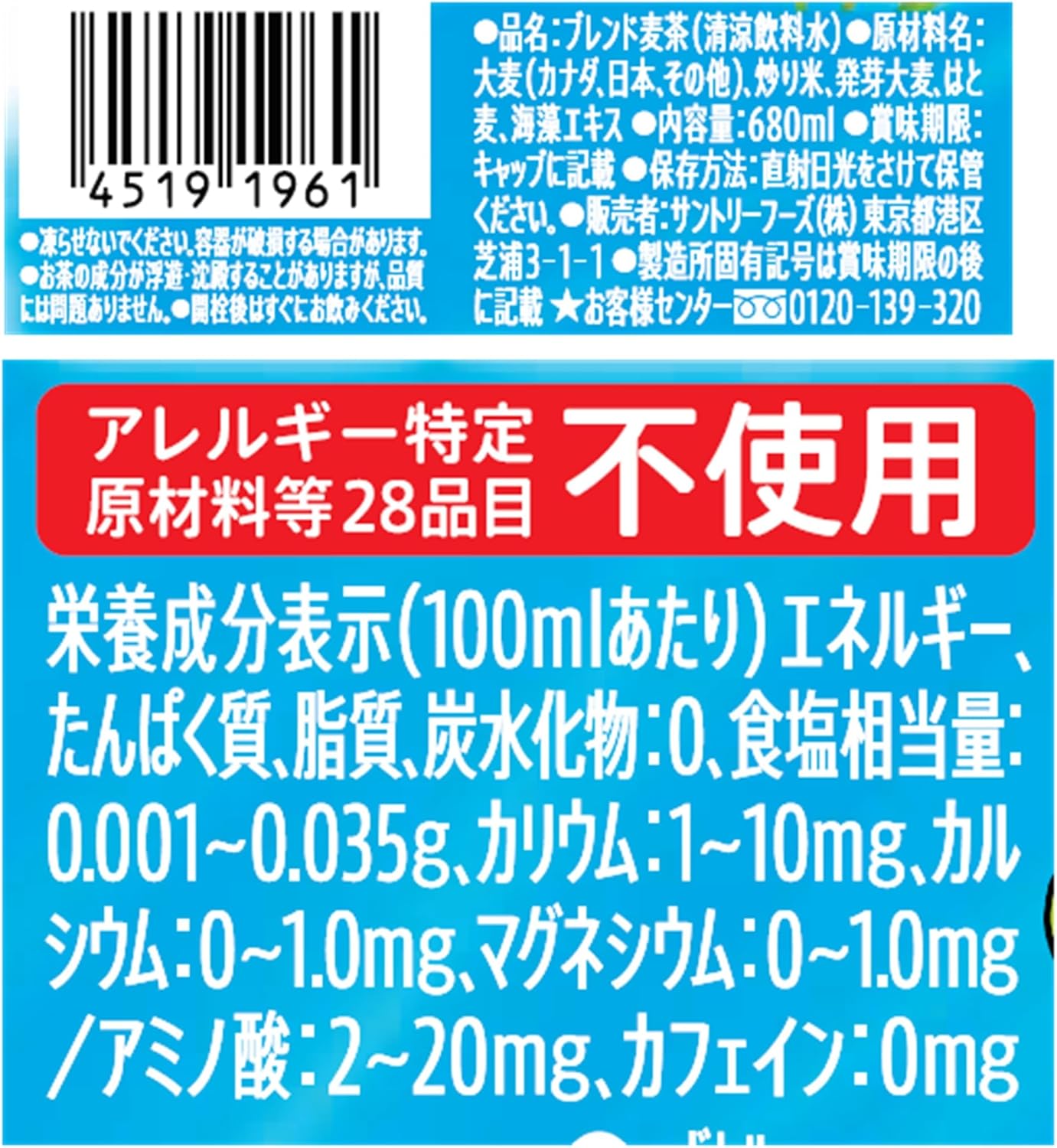 穀物や海藻エキスなどの健康素材にサントリー独自の発芽大麦を加えた、 香ばしいくてすっきり飲みやすい体にやさしい麦茶です。 <カフェインゼロ・アレルギー特定原材料等28品目不使用>