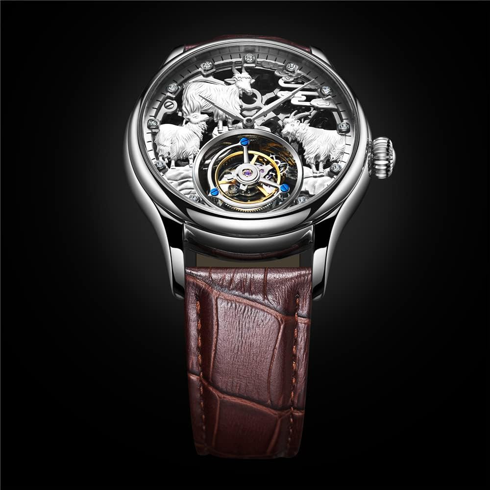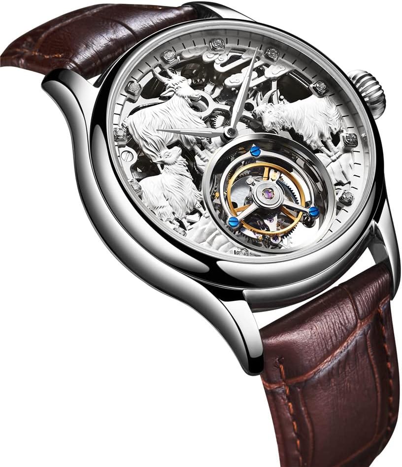 GZFCMY AESOP男性用ビンテージフライホイール腕時計手巻き機械式両面中空ダイヤモンドウォッチ メンズ ステンレススチールとレザー サファイアクリスタル スケルトン トゥールビヨンビジネス時計防水 スーパールミネセンス チャイニーズスタイルヒツジダイヤル (シルバーブラウン) Amazonで販売中
