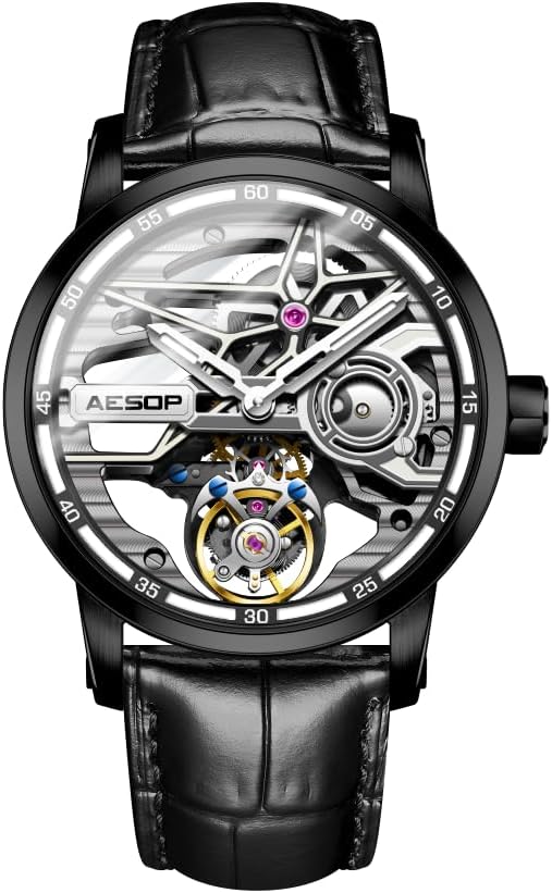 GZFCMY AESOP 男性用 ビンテージフライホイール腕時計 アナログ 手巻き機械式 両面中空ダイヤモンドウォッチ メンズ ステンレススチール と レザー サファイアクリスタル スケルトン トゥールビヨン ビジネス時計 防水 スーパールミネセンス (ブラック)  Amazonで販売中