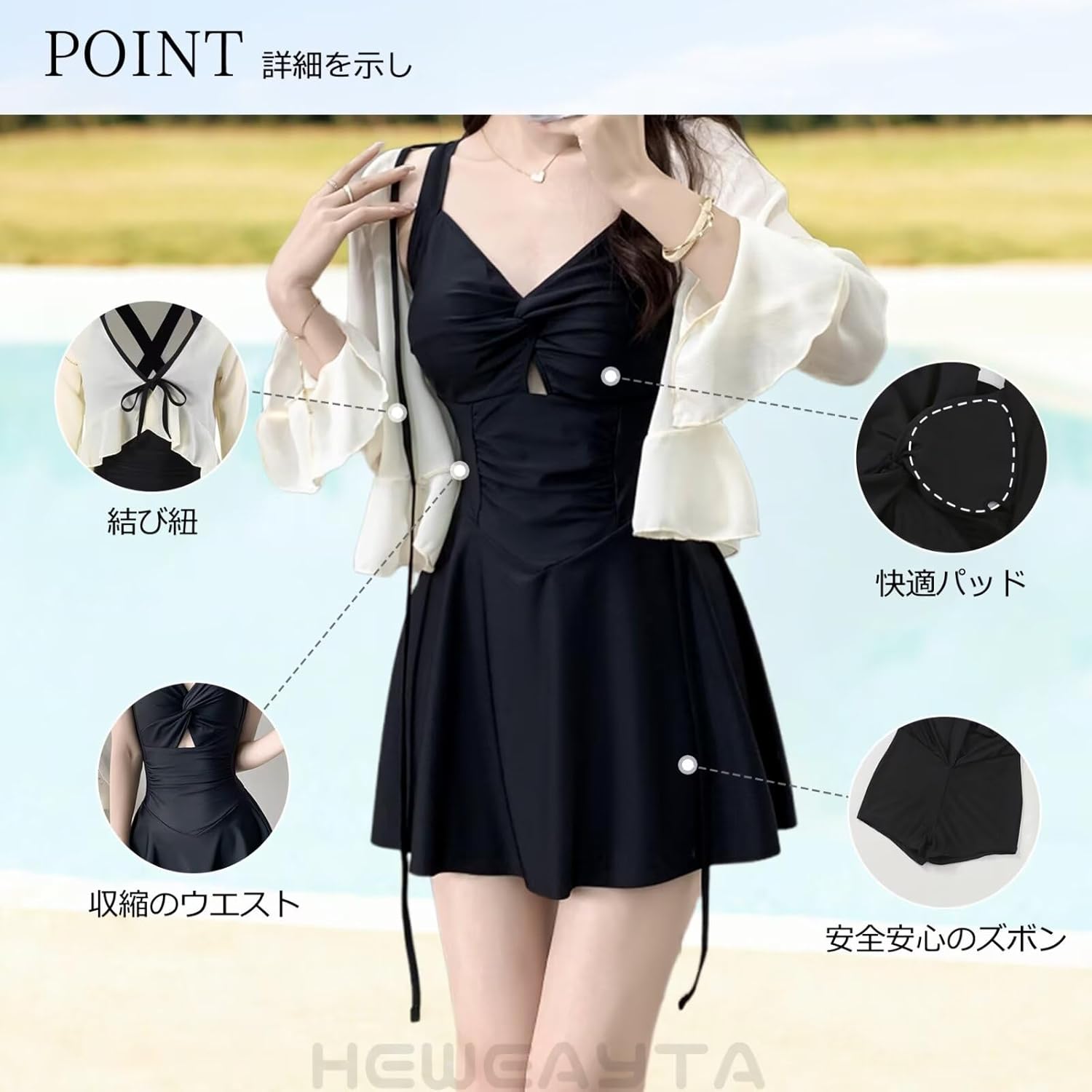 こちらのワンピース水着は、女性の悩みを解消する「美サポート設計」が魅力!