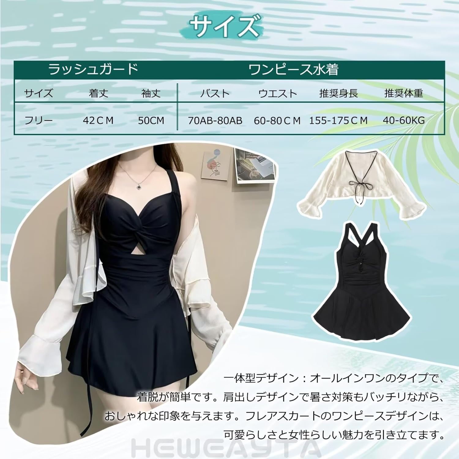 日差しが気になる季節でも適用の2点セットで、紫外線対策はもちろん、スタイルアップも叶える優秀アイテムです! 【セット内容】 涼しく着られるラッシュガード(UVカット機能付き) シルエットを美しく見せるワンピース水着