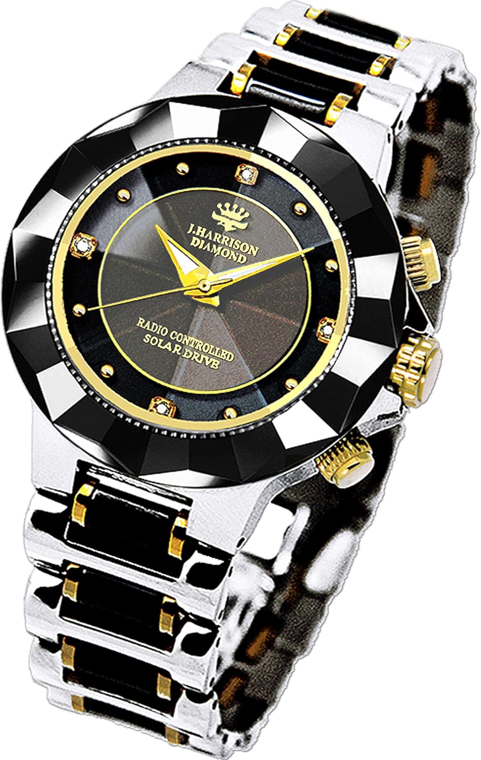 ①全国対応のソーラー電波腕時計は、日本中どこにいてもいつでも正確な時刻を刻む。 ②日本標準時を受信して自動的に時間補正する、どこにいても正確な時間を刻む腕時計。 ③ソーラーバッテリー内蔵。たいへんエコで地球にやさしい腕時計。 ④動きに合わせてキラキラ輝く「8面カット」のクリスタルガラス風防+セラミック製のカッティングベゼル+ブラックセラミックをはめ込んだ高級コンビベルトで動くたびに豪華に輝く ⑤文字盤0・3・6・9時のインデックスには天然ダイヤモンド合計4石をセット(品質保証書付き) ⑥ステンレス+セラミック製のベルトには取り外しのカンタンなDバックルを採用