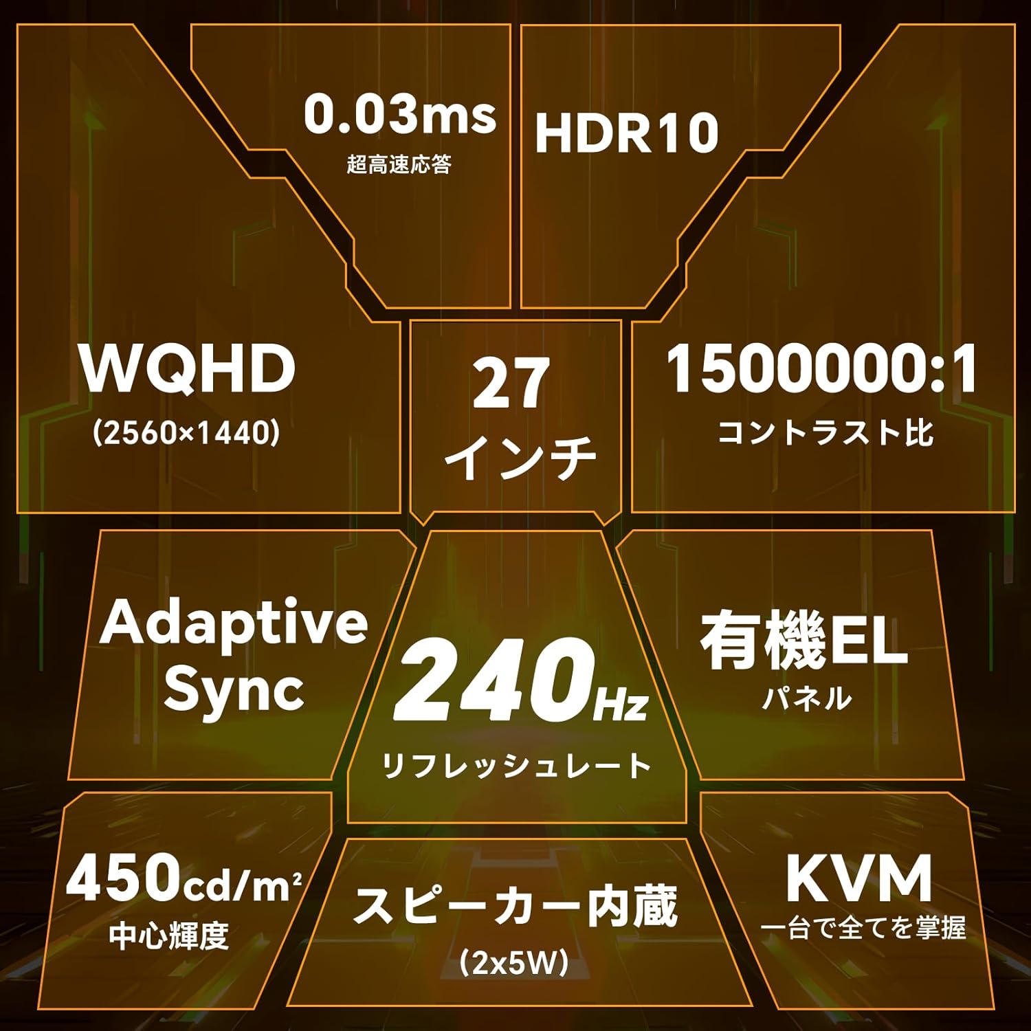 KTC 27インチ 有機ELゲーミングモニター OLED WQHD 2560×1440@240Hz 超高速0.03ms応答速度 (DisplayHDR True Black 400/1500000:1コントラスト比/136sRGB) VESA 75×75 /KVM機能搭載/RGBライト付き (HDMI 2.0 *2/DP 1.4*1 /Type-C 65W給電対応) G27P6S Amazonで販売中