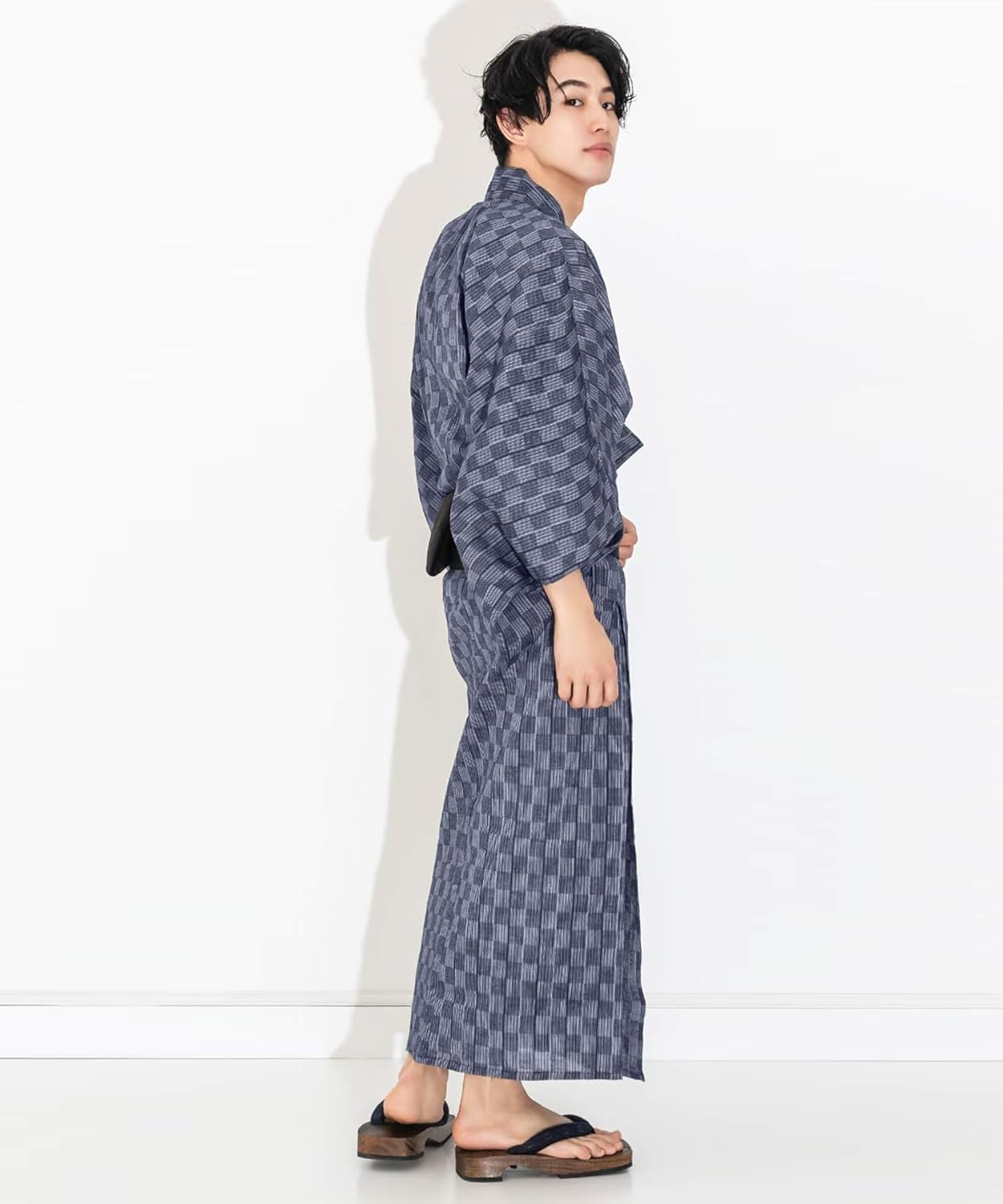 小粋なしじら織り浴衣に、ワンタッチ角帯と焼桐下駄を合わせました。流行に左右されること無く、年代問わず着用いただけます。