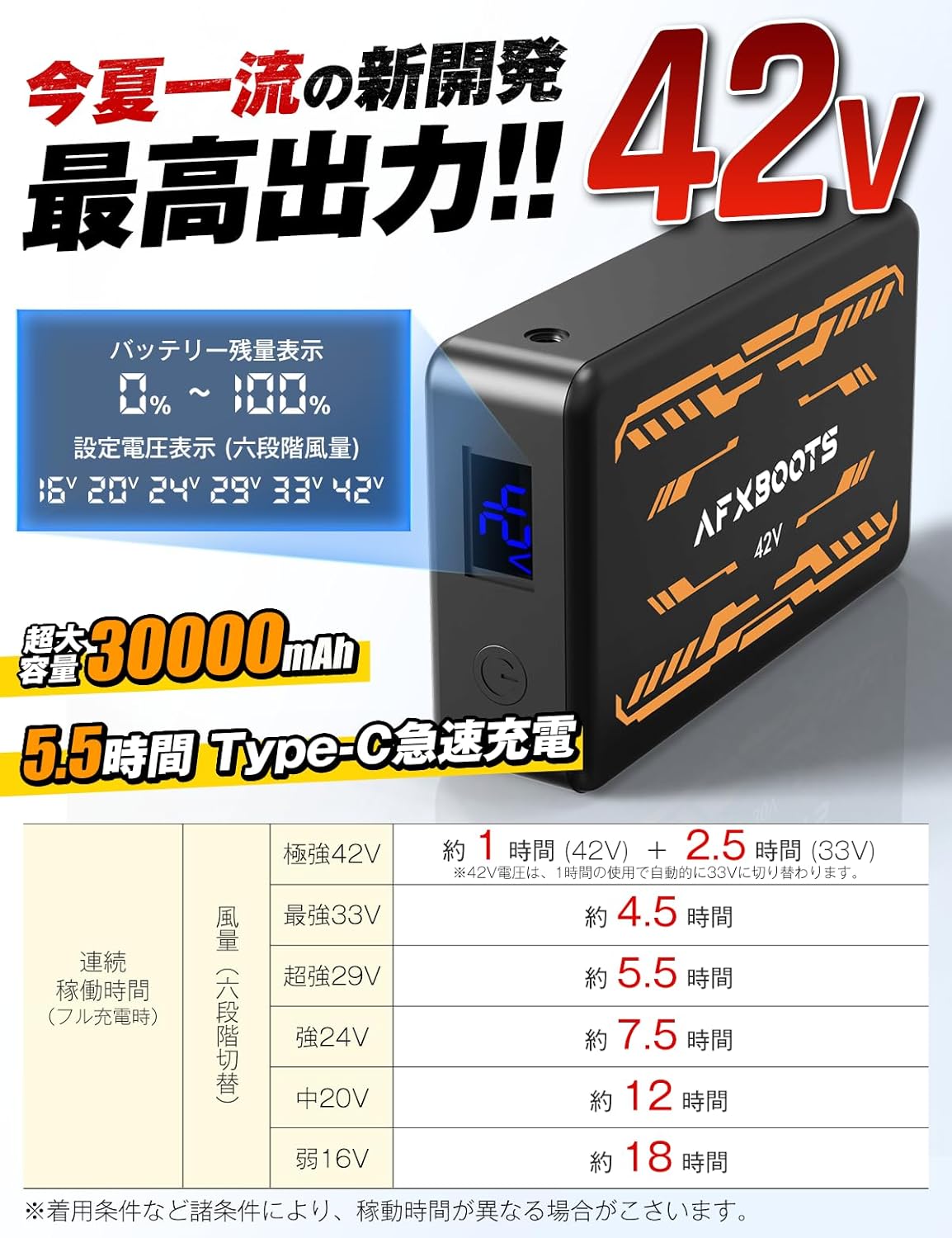 [LABWIND] 2025最強進化 42V超高出力 30000mAh ファンバッテリーセット 192L/S暴風 ファン付きベスト対応 Type-C急速充電 PSE認証済 6段階風速調節 9cmの標準ファン 猛暑対策 作業服用 AFXBOOTS F42N25  Amazonで販売中