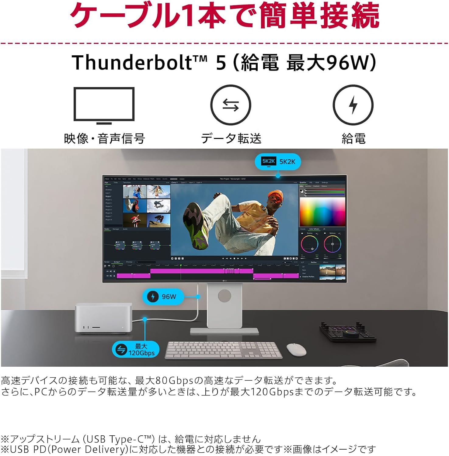 出入力端子:HDMI入力×2、DisplayPort入力(Ver 2.1)、USB Type-C™、Thunderbolt™ 5入力(Power Delivery 96W)、LAN端子(1000Base-T)、USBダウンストリーム(USB 3.2 Gen2x1×2、USB Type-C™×4)、ヘッドホン+マイク(4極ステレオミニジャック)、Thunderbolt出力