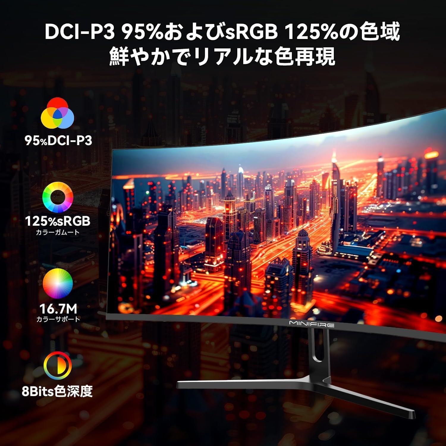 Minifire 34インチゲーミングモニター 曲面ウルトラワイド WQHD(3440*1440p) 165Hz 1ms応答速度 21:9 曲面 1500R VA FreeSync HDR10 sRGB125% 輝度320cd/㎡ 分屏機能/スピーカー内蔵/ HDMI2.1(TMDS)×2,DP 1.4×2/ 三年保証で安心 Amazonで販売中