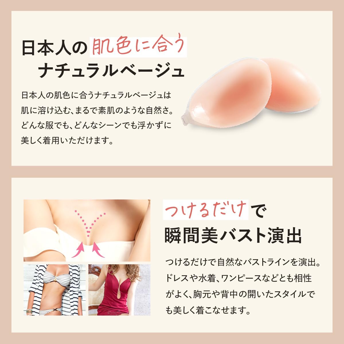 強力粘着で密着フィット:長時間の使用でもズレずにぴたっと密着。自然な谷間メイク:胸の形にフィットするカッティングと厚みで、自然に盛れる。目立たない設計:背中も肩もすっきり見せるノーストラップデザイン。繰り返し使える経済性:洗って何度も使えるからコスパも◎肌へのやさしさ:やわらかシリコン素材で肌あたりなめらか。