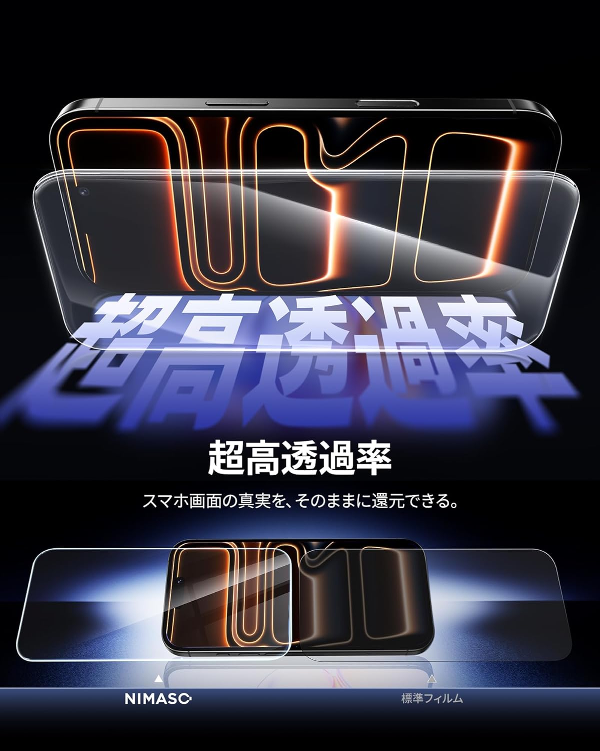 「高感度タッチ・超高透過率」約0.33mmの極薄フィルムで高いタッチ感度を維持しつつ、装着時の違和感を最小限に抑えました。超高透過率により、アイフォン17プロマックス画面本来の美しさをそのまま再現。フィルムをつけていない時と変わらない自然な操作感が特長です。