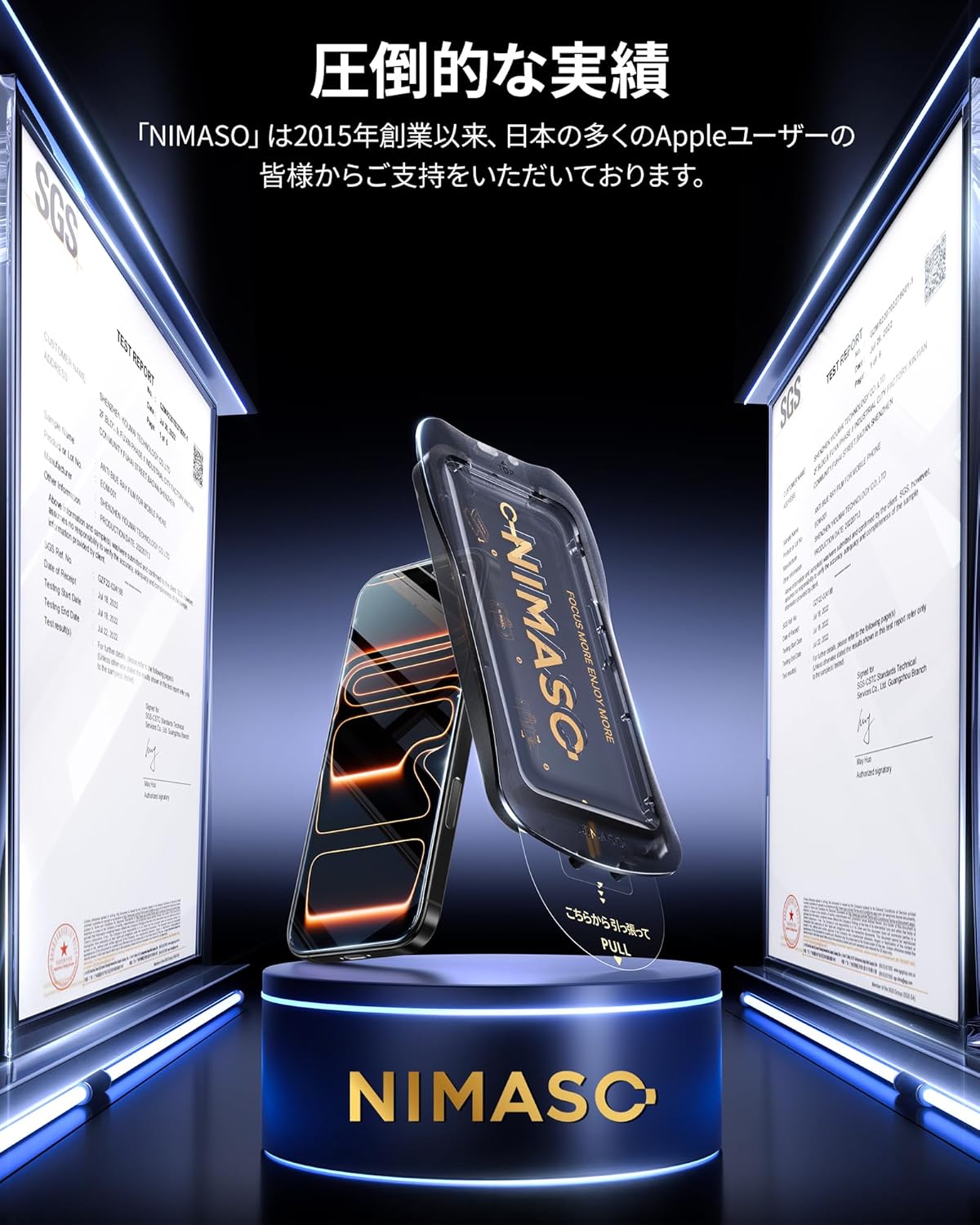 「2ステップ貼付・自動除塵」NIMASO最新の自動除塵ガイド枠が登場!!!被せる、引っ張る、たった2ステップで驚くほど簡単な貼り付け作業ができます!さらに画期的なのが、内蔵された静電式自動除塵構造。ホコリやゴミを自動的に吸着除去するので、貼り付け時の失敗が大幅に軽減します。初めての方でもストレスなく、キレイに貼れるのが特長です。もう気泡やズレに悩まされることはありません!