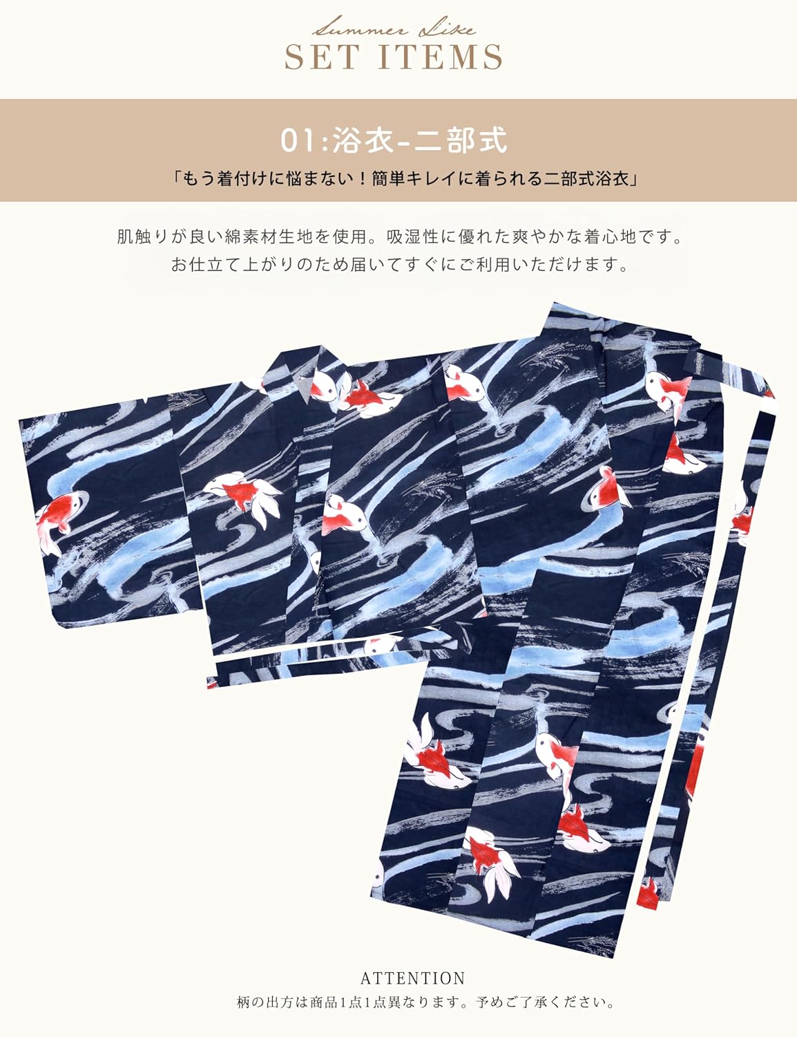 お客様から頂いた声を反映し、かんたんに着付けができ、可愛くトレンド柄で用意しました。「浴衣の単品」「帯のセット」「帯と下駄のセット」とお客様のニーズに合わせてお選びいただけます。