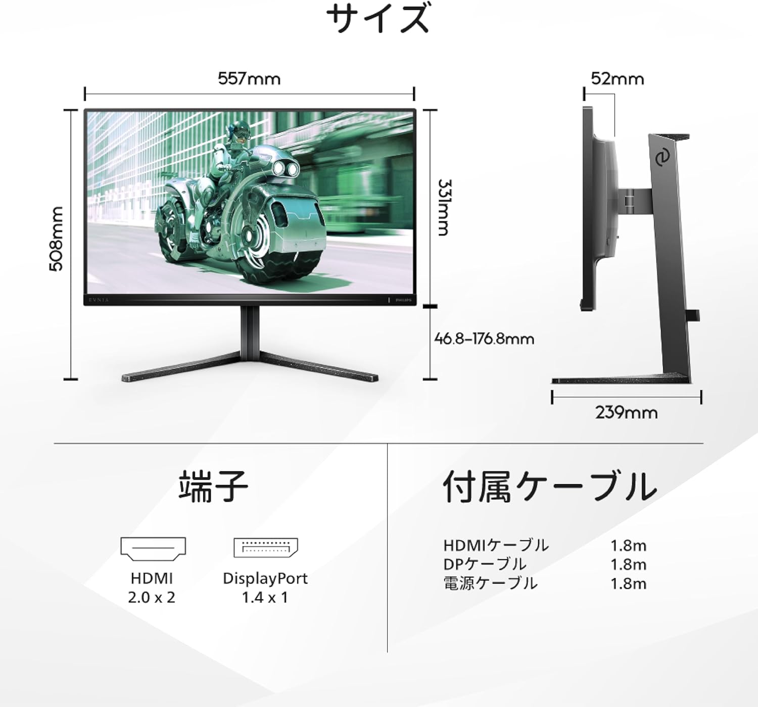 【付属品とケーブル】 DisplayPortケーブル(1.8m)、HDMIケーブル(1.8m)、電源ケーブル(1.8m)、クイックスタートガイド、保証書、ケーブル付属リスト、ベーススタンド、ベース支柱。【本体サイズ(スタンドあり)(mm)】 508 (H) × 557 (W) × 239 (D)、4.34kg。【安心保証サポート】 お買い上げより5年間無償修理保証(詳細は製品画像をチェック!)。
