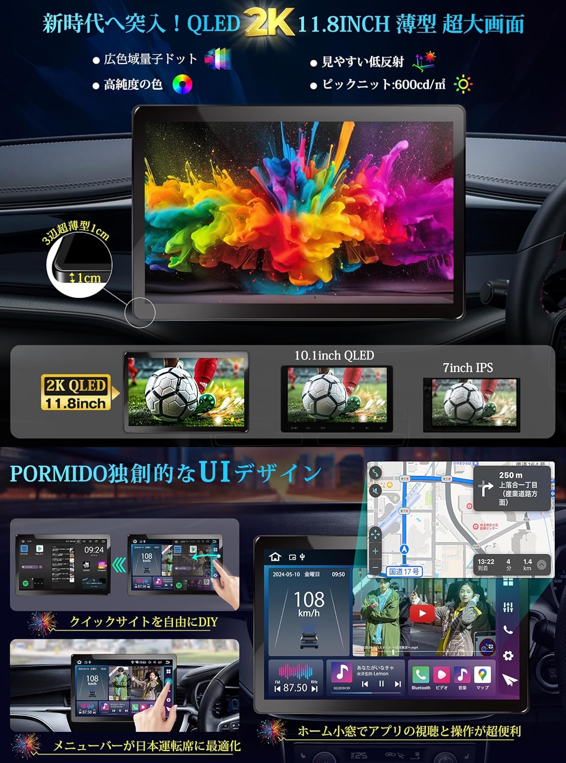 🚗🚗【PORMIDO 2024年業界初の2Kディスプレイ搭載新次元の体験】11.8インチの大画面に2K解像度を誇るディスプレイを搭載し、業界初の革新を実現しました。薄型デザインでスタイリッシュな外観を維持しつつ、1DIN仕様でどの車種にも簡単にフィットします。スペースを取らず、設置が容易なため、幅広い車種でご利用いただけます。【鮮明でリアルな2K映像】映像の細部までクリアに表示。写真や動画、ナビゲーションの地図が驚くほど鮮明です。最新のディスプレイ技術を採用し、豊かで自然な色彩を実現。映像がまるで本物のように生き生きと映し出されます。【直感的な操作とエンターテインメント性】大画面でアイコンや文字が見やすく、操作が直感的で簡単。運転中でも安全に使用できます。映画や動画を楽しむことで、車内がまるでシアターに。家族や友人との長距離ドライブも退屈しません。2K ディスプレイオーディオでナビゲーションが見やすく、詳細な地図や交通情報を一目で確認可能。運転がスムーズになります。【3辺薄型で洗練されたデザイン】スリムベゼルデザインで、画面占有率が高く、車内のインテリアに高級感をプラス。