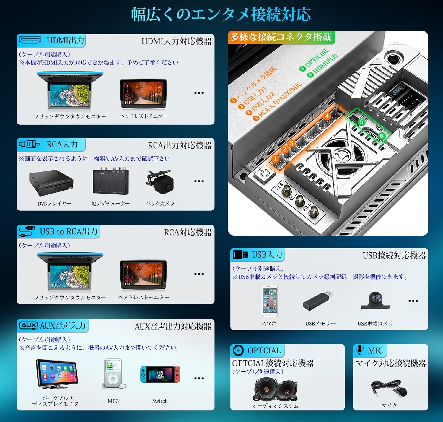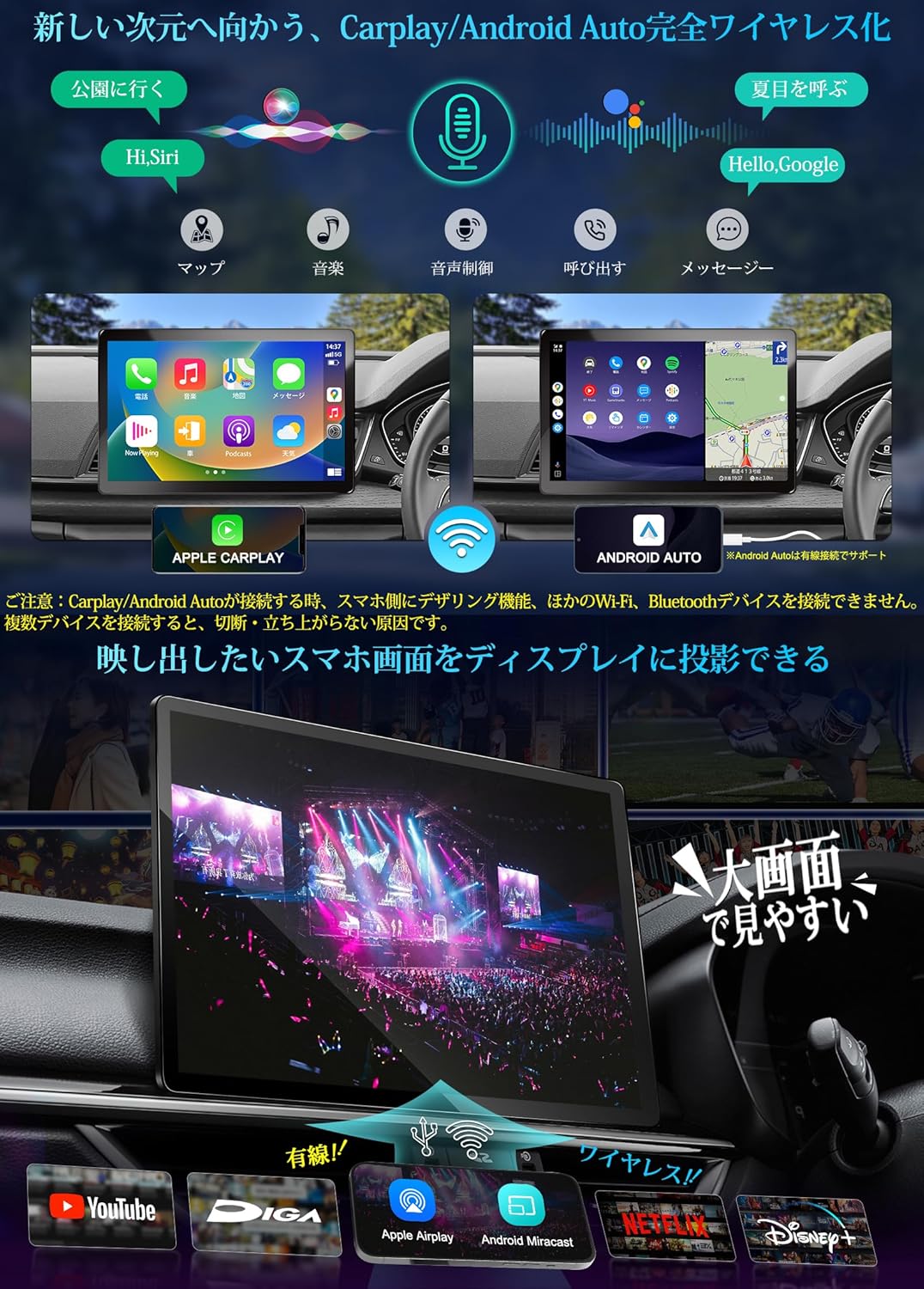 🚗🚗【ワイヤレスCarPlay/Android Auto対応・ケーブルの煩しさから解放】ワイヤレスでのCarPlayナビとAndroid Autoナビに対応。スマートフォンと簡単に接続でき、ナビゲーション、音楽、メッセージ送受信などの機能を車内でシームレスに利用可能です。ケーブルの煩わしさから解放され、スマートなドライブ体験を提供します。【ワイヤレス・有線対応ミラーリング機能】ワイヤレスおよび有線でのAirplay、Miracast機能も完備。スマートフォンの画面を車のディスプレイにそのまま映し出すことができ、動画視聴やアプリの使用が可能です。大画面でスマートフォンのコンテンツを楽しむことができ、エンターテインメント性が大幅に向上します。【2WAYインターネットを簡単に繋げる】①2.4G/5GWi-Fiに対応:スマホ端末のデザリング機能・車載Wi-Fiの利用でインターネットを簡単に接続できます。②SIMカード接続:直接的にSIMカードを機器と接続してドライブ中に途切れることなくインターネットを利用でき、ナビゲーションやエンターテインメント機能を最大限に活用できます。