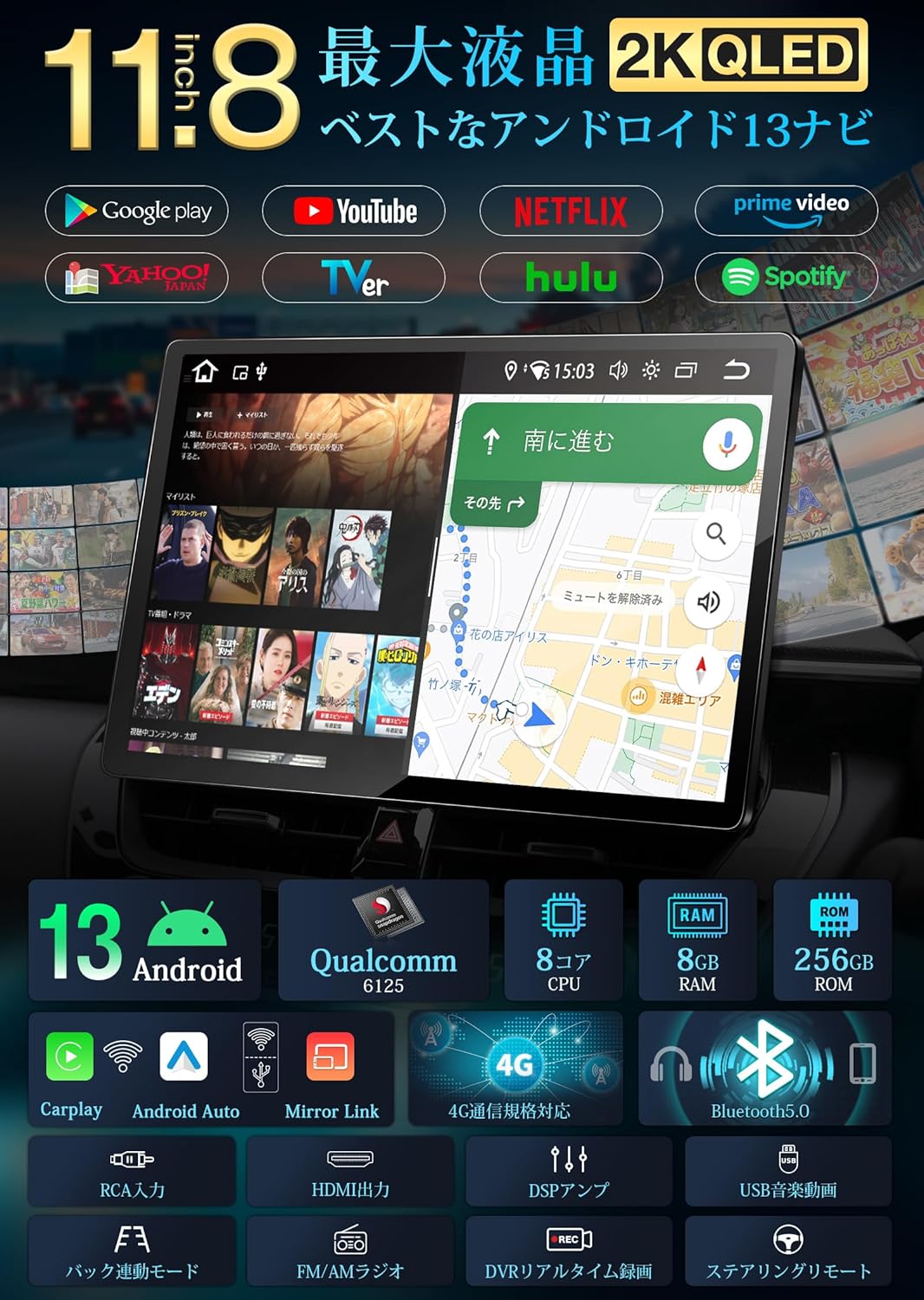 PORMIDO 2024新型11.8インチ 2K/QLED液晶のAndroid13カーナビ【最高8コアQCM6125 8+256GB】WiFi/SIMカード対応 YouTube Hulu等が観れる1DINディスプレイオーディオ ワイヤレスCarPlay/AndroidAuto/Mirrorlink HDMI出力 Bluetooth/DSP/GPS内蔵 バック連動 技適取得済み品【PRA106】 Amazonで販売中