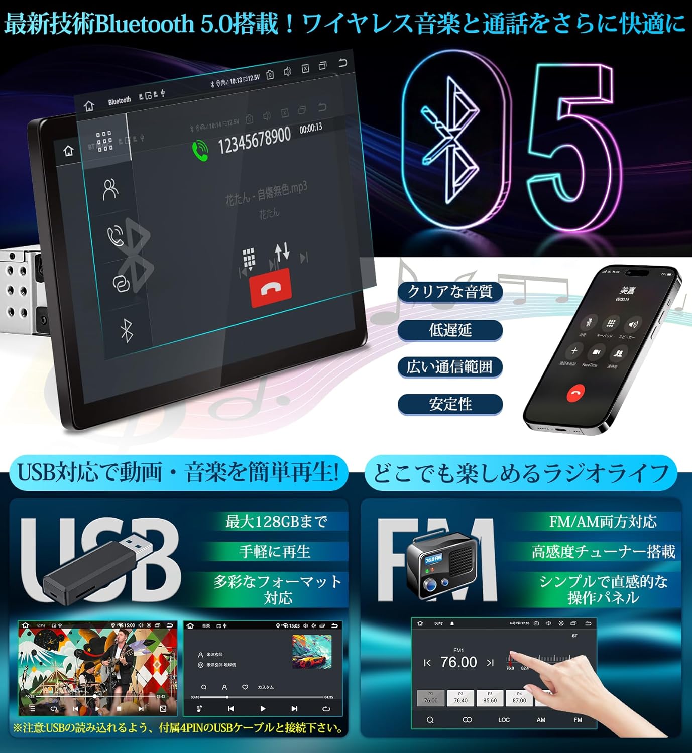 🚗🚗【高速かつ安定のBluetooth 5.0】Bluetooth 5.0を搭載し、従来のバージョンよりも高速で安定した接続を提供します。音質の劣化が少なく、クリアで豊かなサウンドを楽しむことができます。また、Bluetooth電話機能を搭載し、ハンズフリー通話が可能です。運転中でもスマートフォンに触れることなく、音声で通話の応答や終了ができます。【DSP音響調整で極上の音質体験】PRA106カーオーディオに内蔵のDSP(デジタルシグナルプロセッサ)音響調整設定により、車内の音響環境を最適化。低音から高音まで、細かい調整が可能で、自分好みのサウンドを作り出せます。どんな音楽ジャンルでも、クリアで臨場感あふれる音質を提供し、ドライブを一層楽しくします。【PBP-2分割画面機能搭載】android ディスプレイオーディオはPBP機能を搭載し、1つのディスプレイで2つの異なるソースを同時に表示可能。これにより、複数の情報を一度に確認できるため、運転中の利便性が大幅に向上しますね。