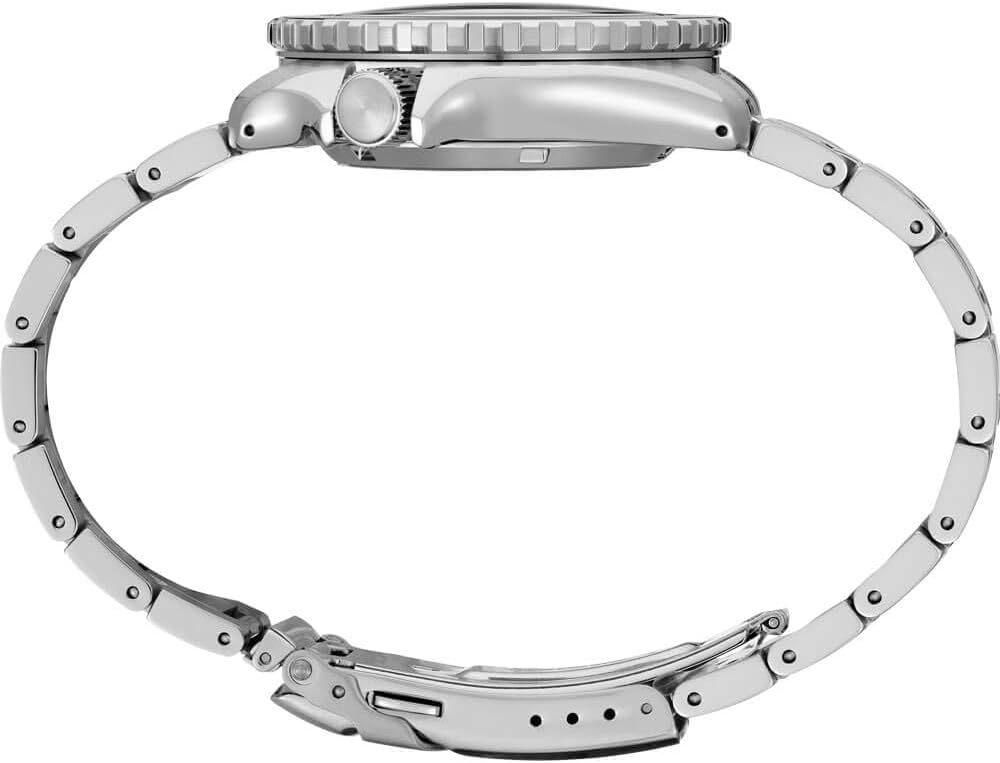 このセイコーメンズSRPK97 5スポーツウォッチは、直径42.5mmの自動巻きムーブメント、カーブしたハードレックスクリスタル、ブルーダイヤル、ステンレススチールケースとブレスレットを備え、10気圧防水です。