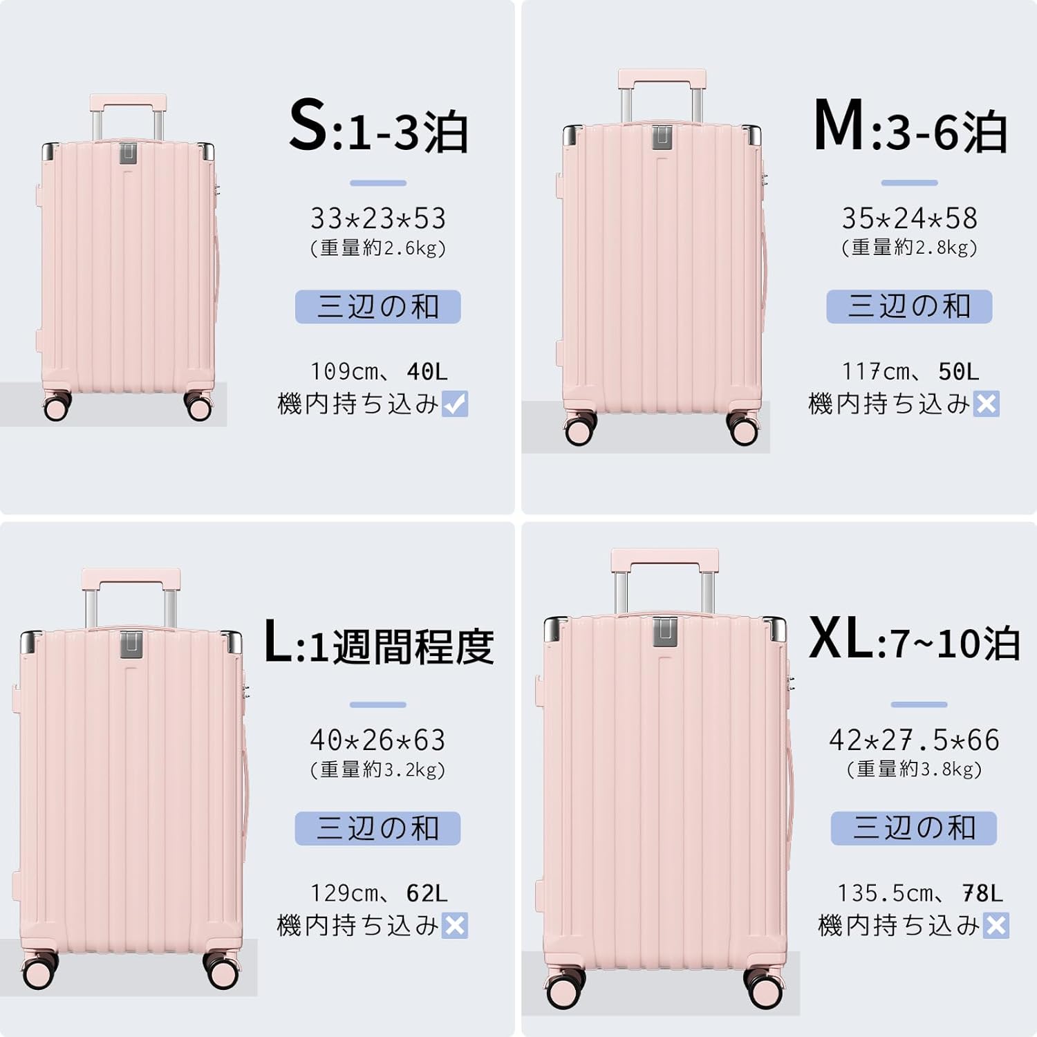 🧳【サイズ】Sサイズ(機内持ち込みOK): 33×23×53cm(重量約2.6kg)、容量約40L(1~3泊対応);Mサイズ:35×24×58cm(重量約2.8kg)、容量約50L(3~6泊対応);Lサイズ:40×26×63cm(重量約3.2kg)、容量約62L(1週間程度);XLサイズ:42×27.5×66cm(重量約3.8kg)、容量約78L(7~10泊対応)※サイズ測定には多少の誤差がありご了承ください。