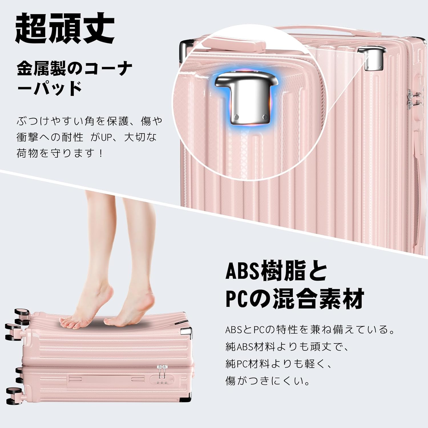 🧳【軽量で頑丈なABS+PCボディ】 本体は軽量性と耐衝撃性に優れたABS樹脂とPCの複合素材を採用。女性でも楽に持ち上げられる重さです。表面に施された無数の微細な凹凸模様が傷つきを防止し、さらに四隅にアルミニウム合金製メタルガードを4ヶ所配置。耐衝撃性能を向上させることで、スーツケースの耐久性をさらに高めています。