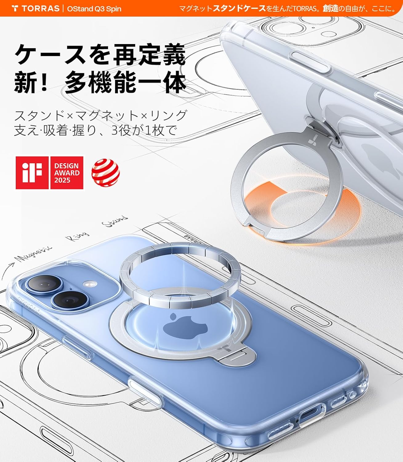TORRAS iPhone 17 用 ケース【多機能一体・360°新定点回転スタンド】 Magsafe対応 【Ostand Q3 Spin】高耐久性 耐衝撃 ゼンマイ式スタンド リング 縦横両対応 マグネット搭載 急速充電対応 指紋防止 クリア Amazonで販売中