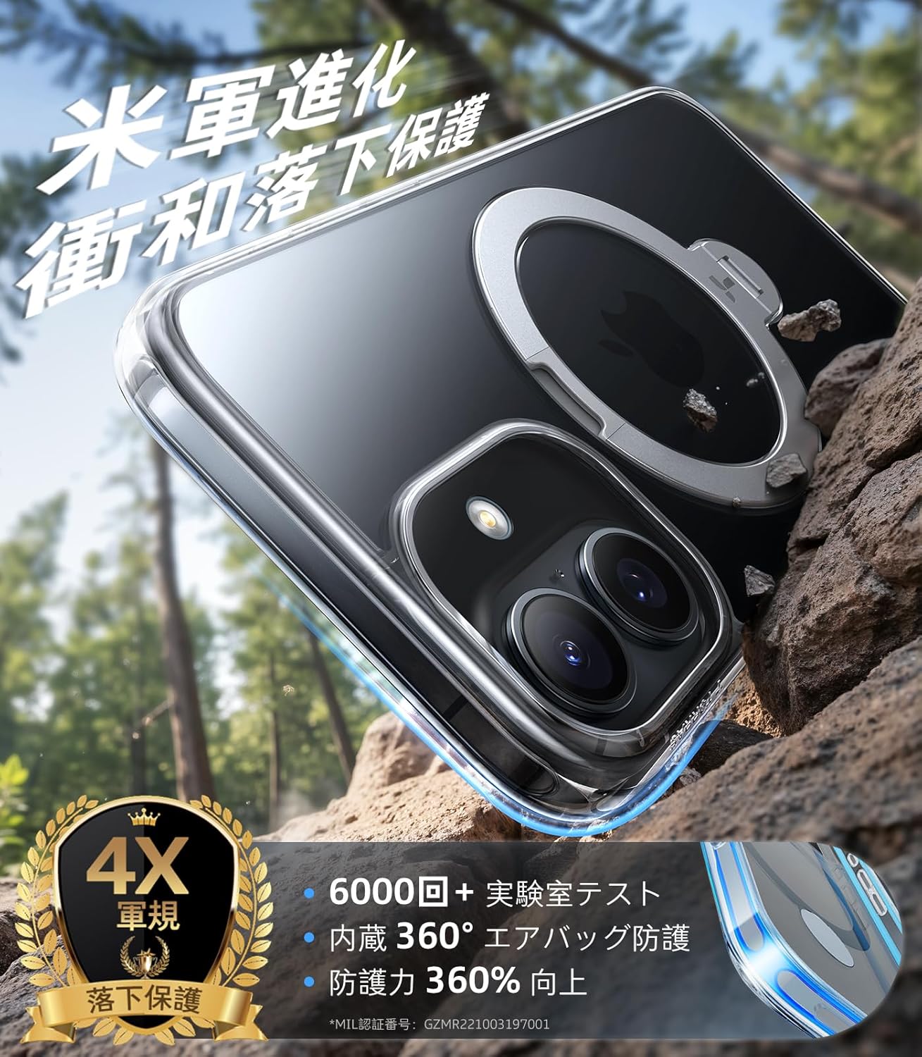 【米軍耐衝撃・高額な修理代を心配なし】Ostand Q3 Spin は 2025 年最新型の 3 層構造ショックアブソーバーを搭載し、航空級アルミニウムフレームスタンドと耐摩耗 PC を組み合わせた軍規級保護ケース。日常では電車の混雑で落としても端末を傷から守る。米軍規格 MIL-STD-810H をクリア(認証番号:GZMR220300651)し、端末コーナーに 0.5mm 段差設計を施して画面とカメラを保護し、3m 高さから 100 回落下しても亀裂を生じにくい。薄型デザインが iPhone のデザインを損なわず、グリップ性のある表面処理で滑落リスクを軽減。